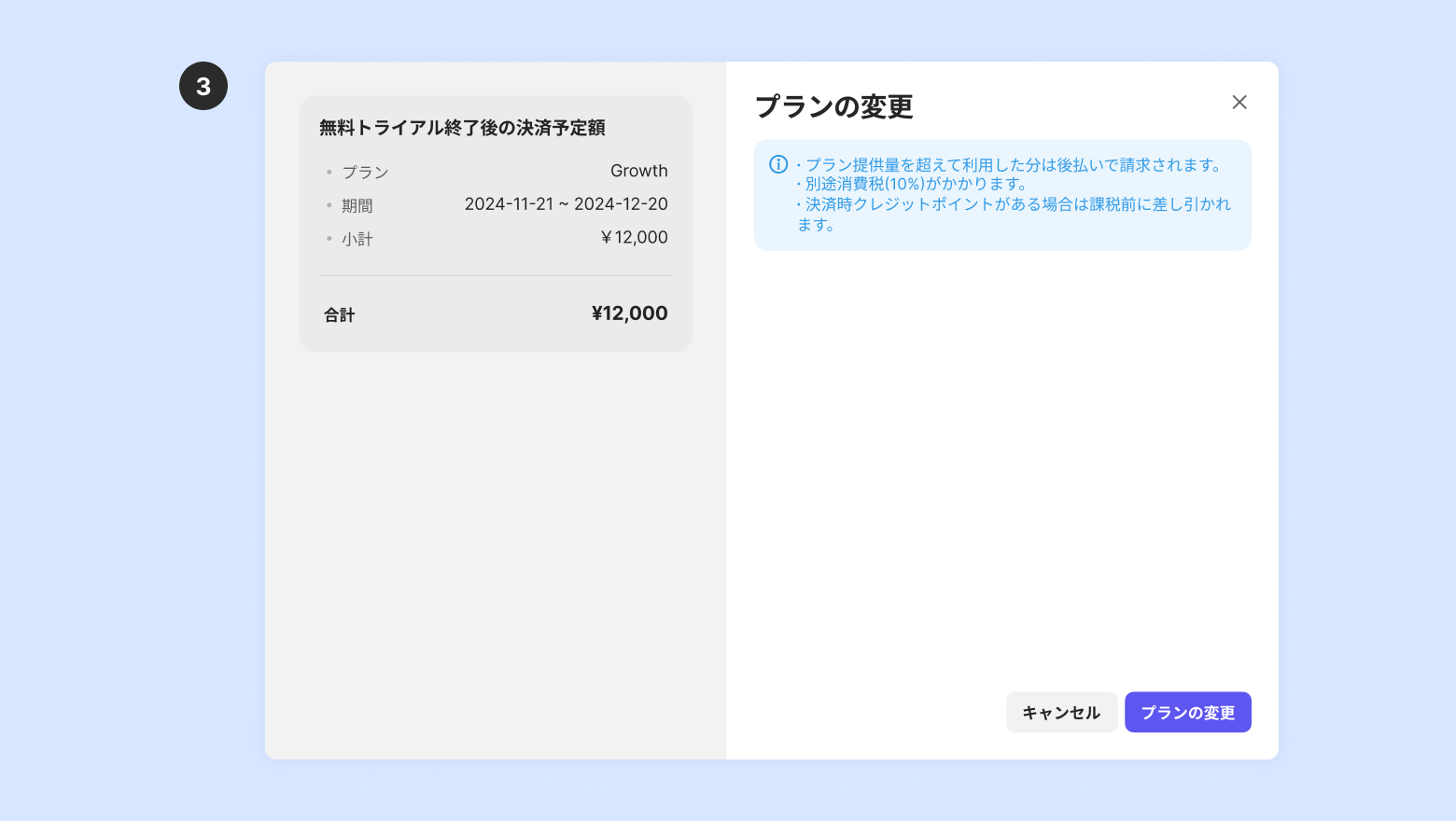 料金を確認後 [プラン変更] をクリックします。カード情報が登録されていない場合はカード情報の登録画面が表示されます。