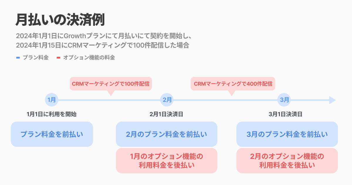 2024年2月1日:1月1日〜1月31日のプラン提供量を超過して利用した分&オプション機能の利用量+2月1日〜2月29日のGrowthプランの料金を先払い