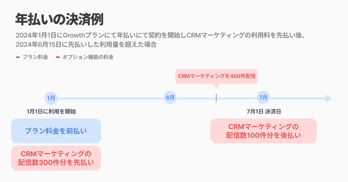 例)プランとワークフローは1年間利用予定だが、契約から半年後のタイミングにCRMマーケティングの利用を考えているケース→プランを年額払い+ワークフローの利用料は前払い、そしてCRMマーケティングは利用後後払いで利用