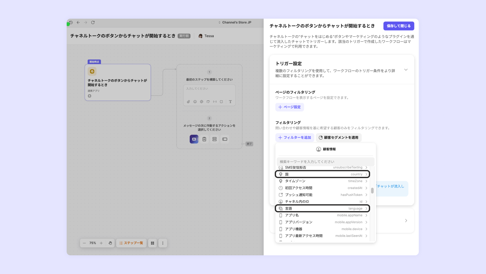ワークフローを作成する際、フィルタリングで国や言語を設定すると、該当のワークフローが設定した国や言語でアクセスした顧客にのみ表示されます。(→ワークフローを見る)