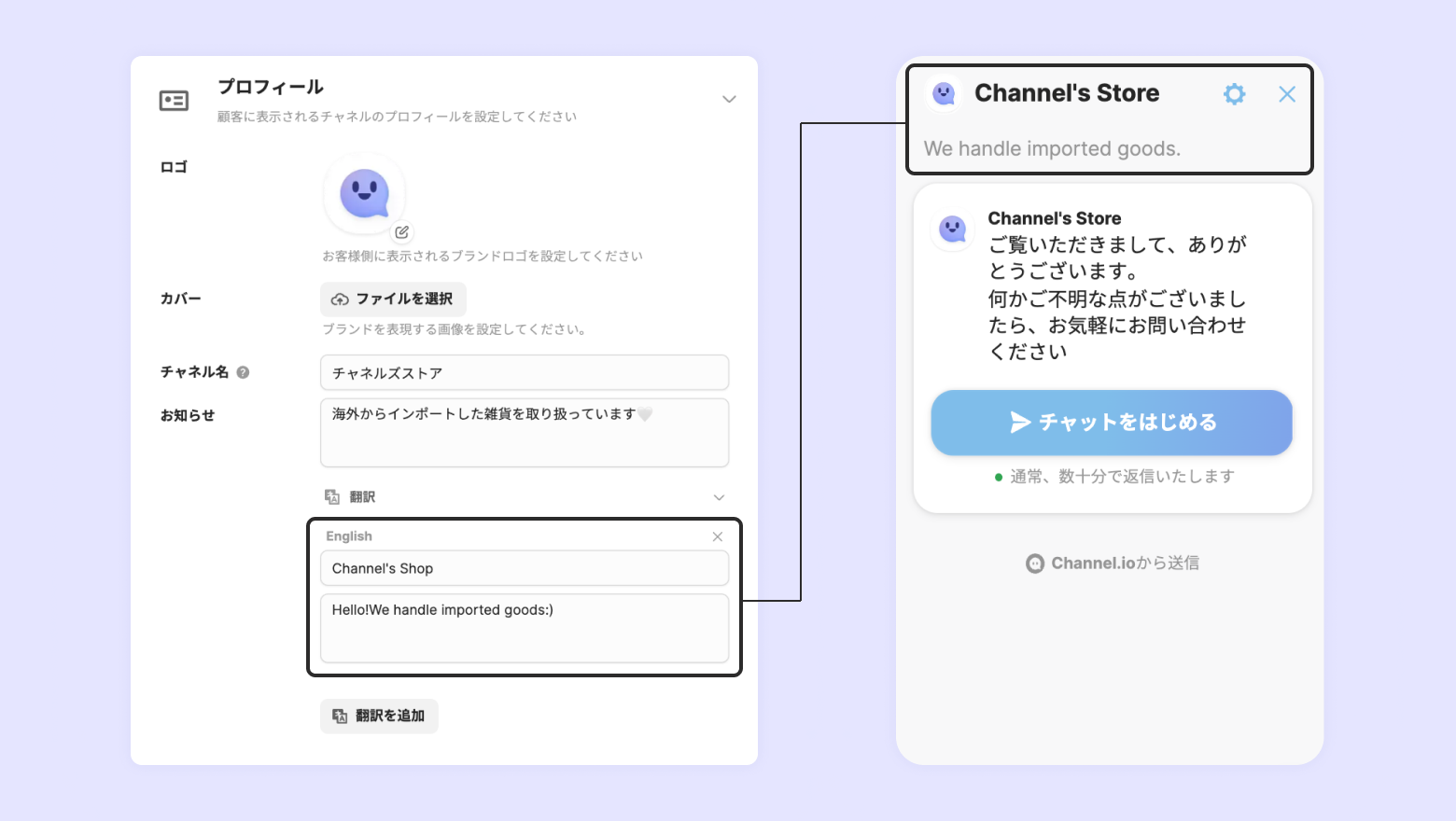 [プロフィール] - [翻訳] で日本の顧客には日本語で、外国の顧客にはその国の言語で、チャネルのプロフィールを表示できます。