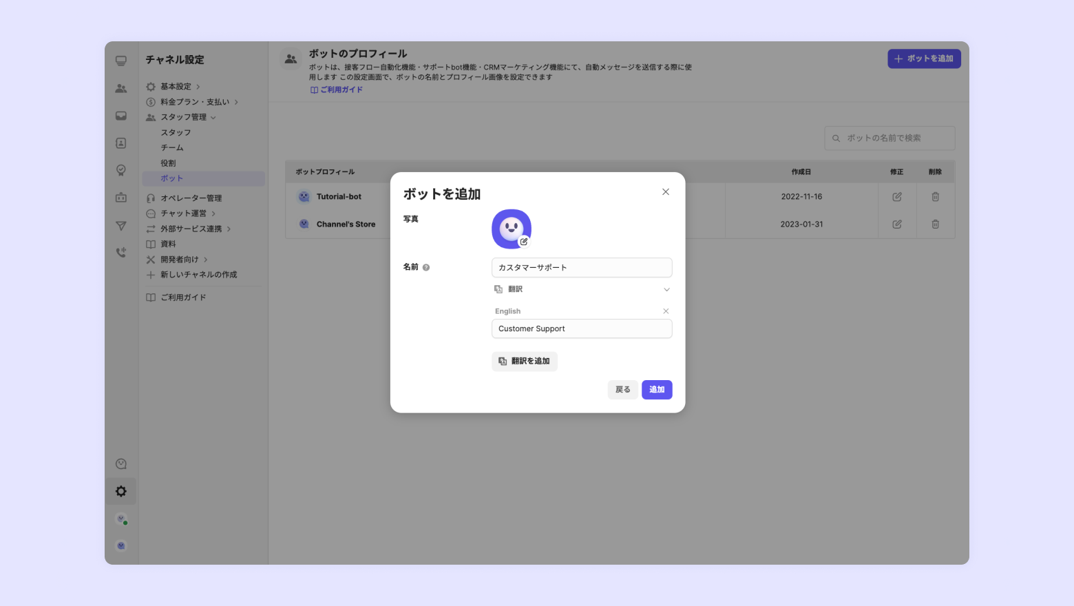 自動メッセージを送信するボットの名前も、言語別に設定可能です。 ただ既に作成済みのボットには翻訳を追加できませんので、ボット作成時に翻訳を追加してください。