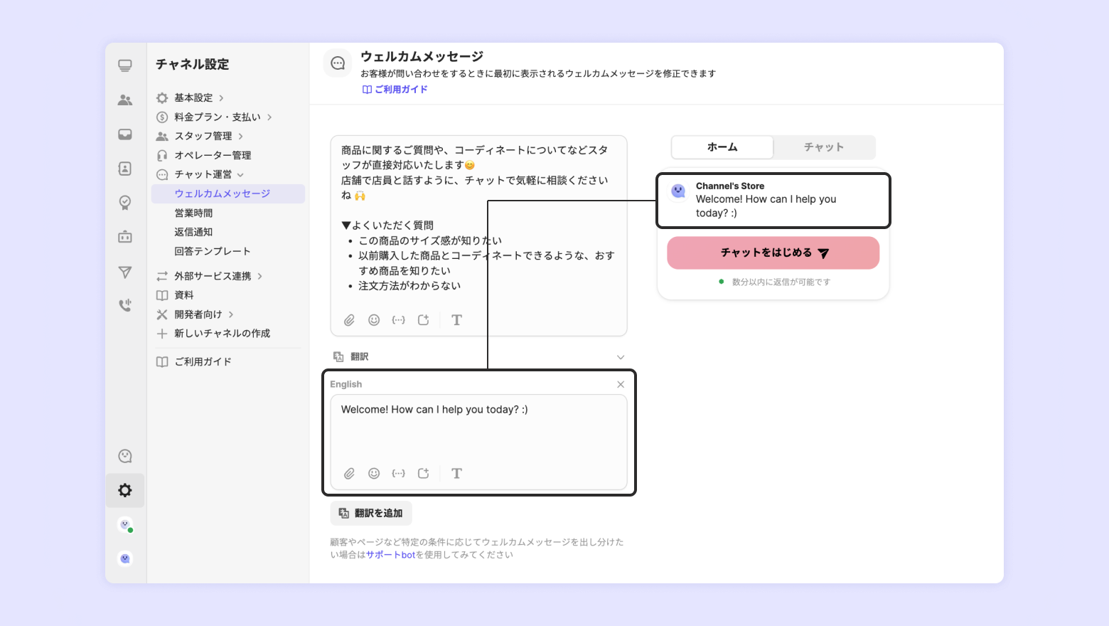方法:[チャネル設定] - [問い合わせ] - [ウェルカムメッセージ] - [翻訳]