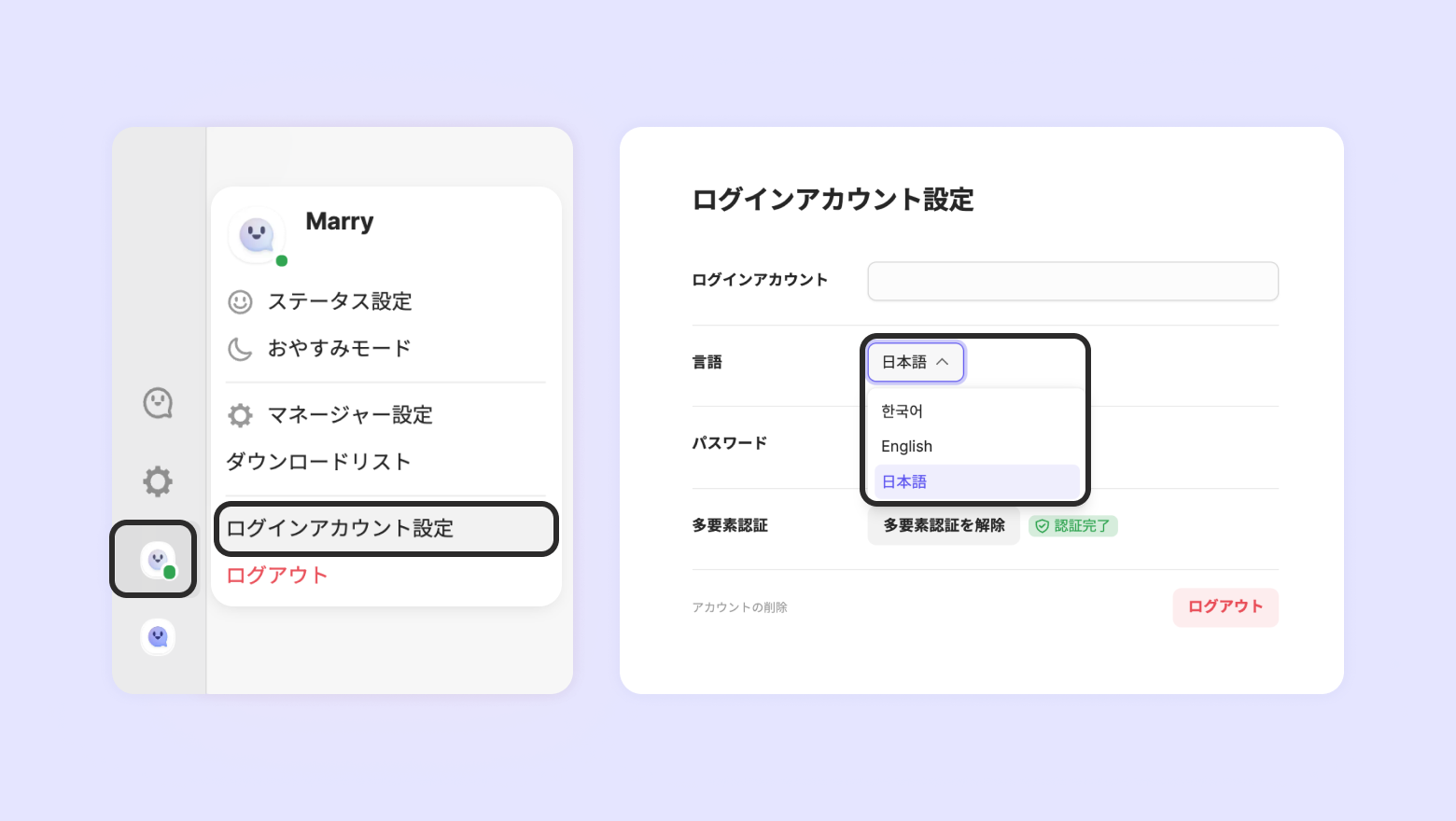 方法:[アカウント設定] - [ログインアカウント設定] - [言語]