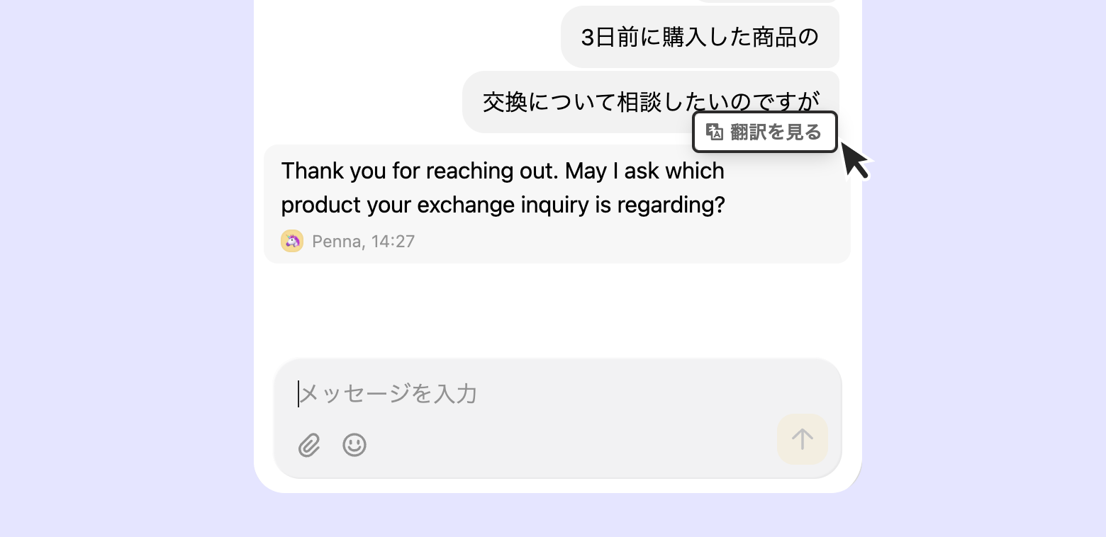 顧客の言語とオペレーターが送信したメッセージの言語が異なる場合、顧客がメッセージにマウスを合わせると「翻訳を見る」オプションが表示されます。