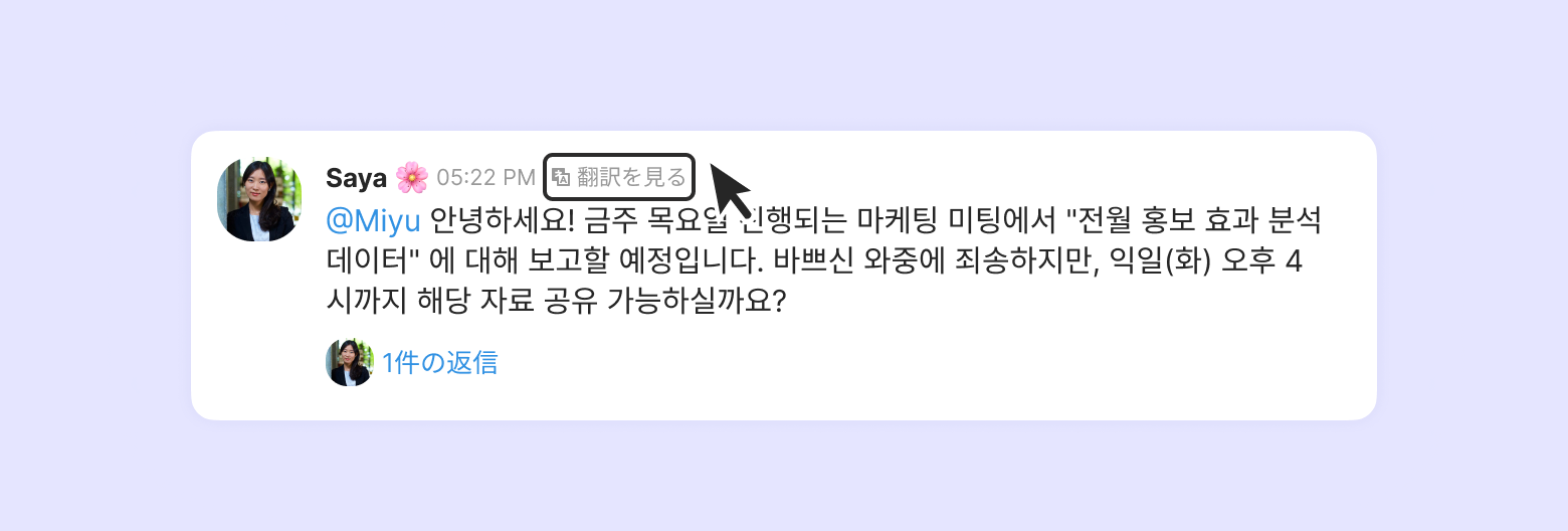 問い合わせ対応時は [翻訳を見る] をクリックすると、顧客の言語/チームメンバーの言語設定に合わせて自動翻訳でき、翻訳はPapago翻訳とGoogle翻訳を使用しています。