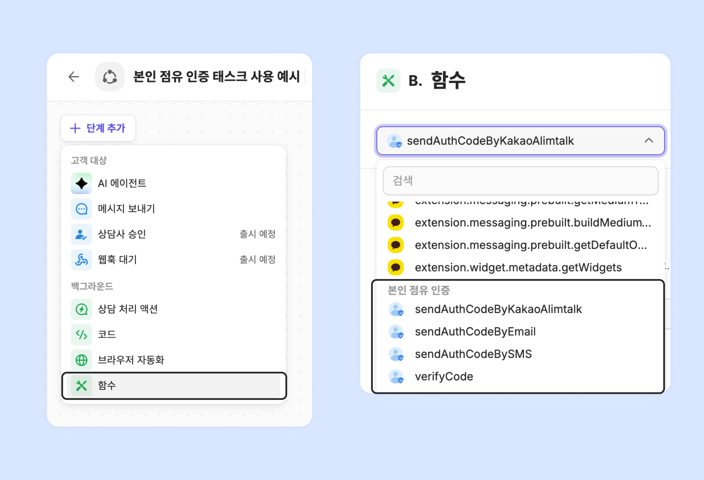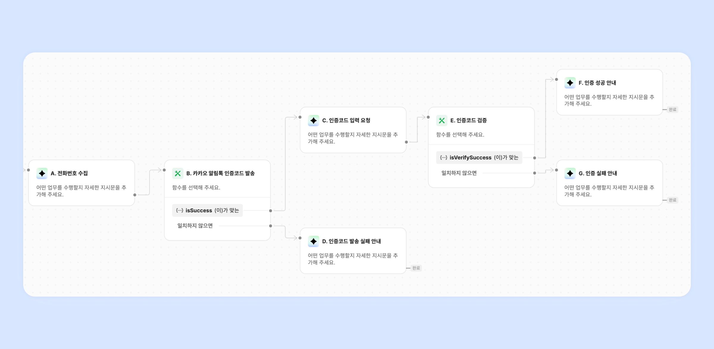 본인 인증이 필요한 기존 태스크 (예: 주문 조회, 취소/반품 접수 등) 안에 인증코드 발송 → 검증 함수 단계를 추가하는 방식으로 활용하세요. 기존 태스크 흐름 중 본인 확인이 필요한 시점에 함수 단계를 끼워 넣으면 됩니다.