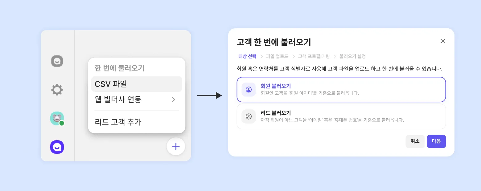 이 때, 회원 고객의 정보를 불러오기할 지, 리드 고객의 정보를 불러오기할 지 선택합니다. (→ 회원과 리드의 차이 알아보기)