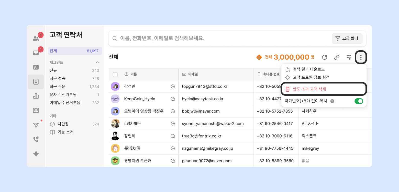 관리 고객 수(MU)가 한도(플랜 한도 또는 수동 설정 한도)를 초과하여 숨김 처리된 모든 고객 정보가 일괄 영구 삭제됩니다.