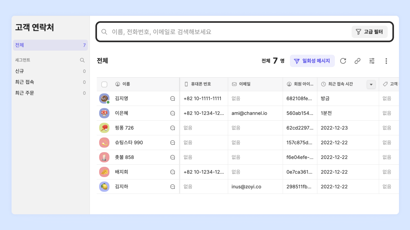 검색창에 이름, 휴대폰 번호, 이메일을 입력하여 고객을 빠르게 검색해보실 수 있어요.