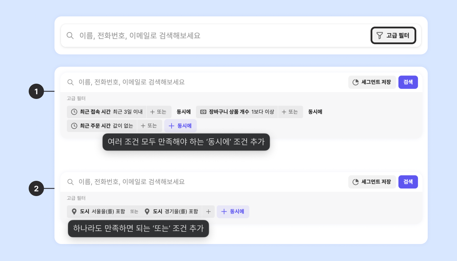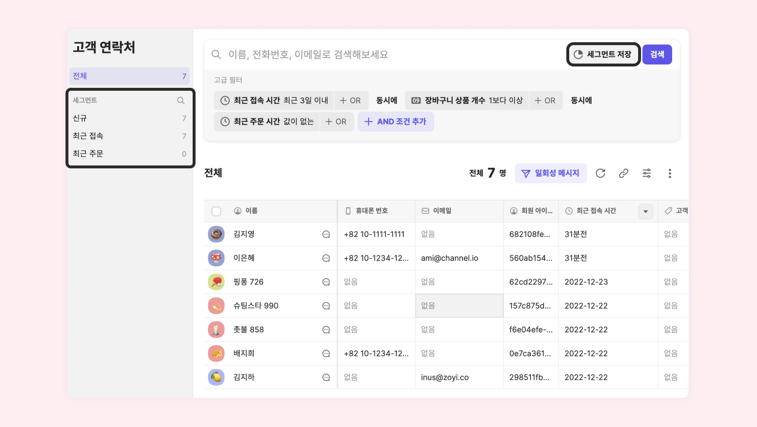 세그먼트란 원하는 필터링 조건을 그룹화하여 관리하는 기능이에요. 설정한 필터링 조건대로 언제든지 고객 목록을 불러오도록 세그먼트를 설정할 수 있습니다.