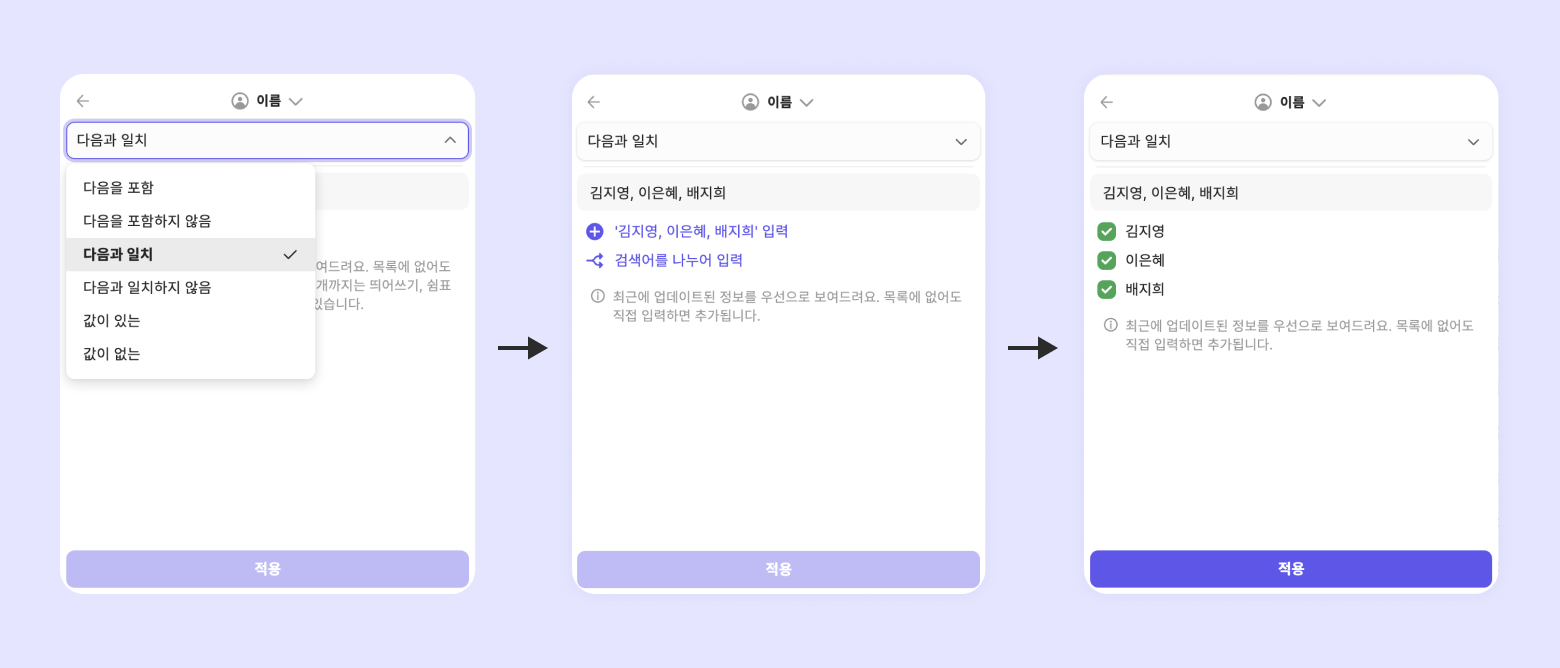• 고급 필터와 빠른 검색을 동시에 활용하실 수 있어요. 원하시는 필터 조건을 설정 후, 검색어를 입력하면 필터 조건 안에서 검색하실 수 있습니다.