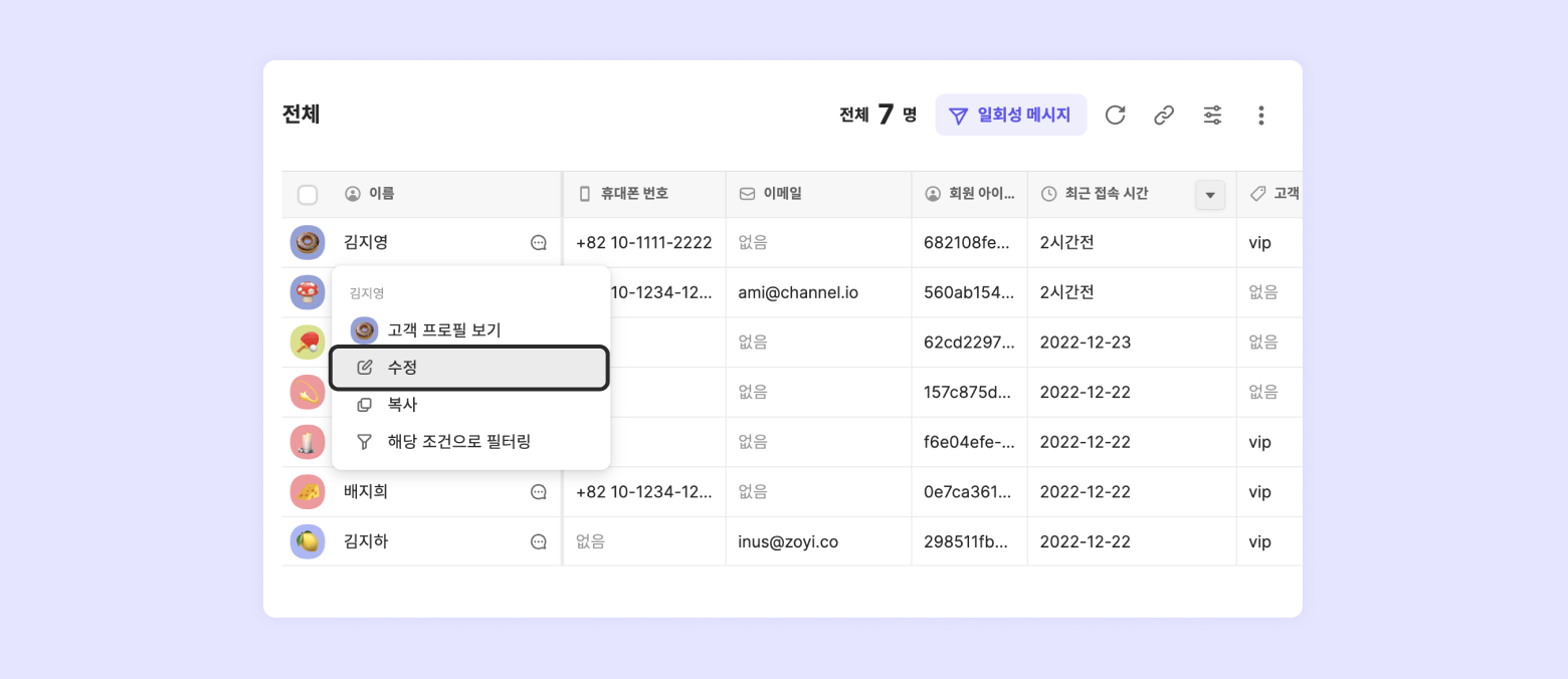 • 고객 태그, 마케팅 수신 동의 여부, 차단 설정은 목록에서 벌크 액션으로 일괄 수정이 가능합니다.