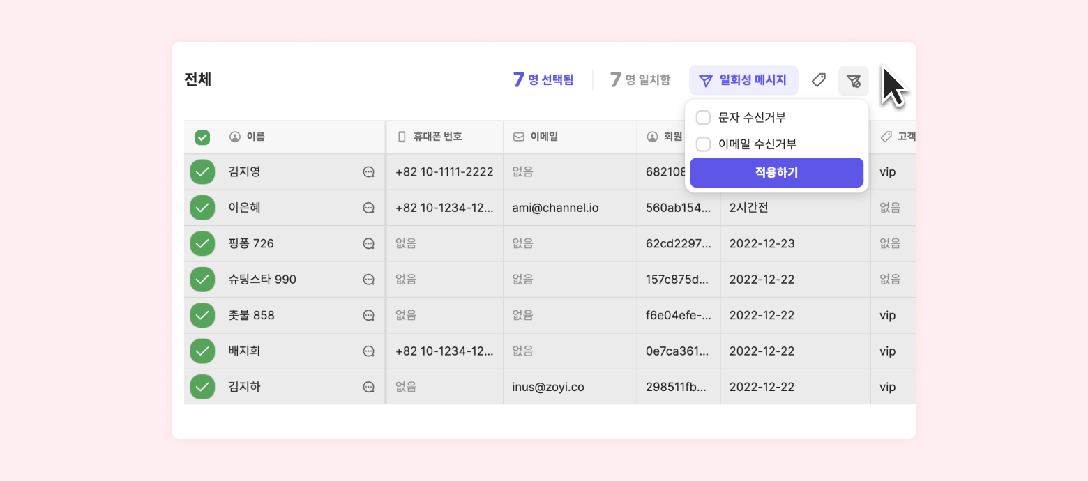 • 체크박스 선택시 필터링된 화면에 로딩된 고객 전체가 선택됩니다. (스크롤 한 번에 100명씩 로딩)