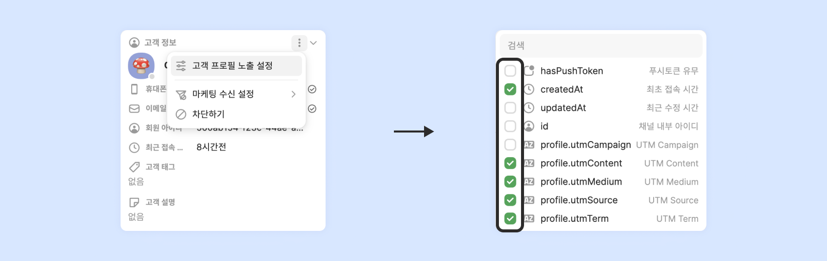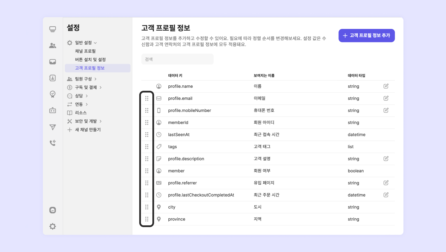 • 고객 프로필 정보 설정: 고객 연락처에서 보이는 데이터 항목의 순서와 노출 여부를 설정할 수 있습니다. (→ 자세히 보기)