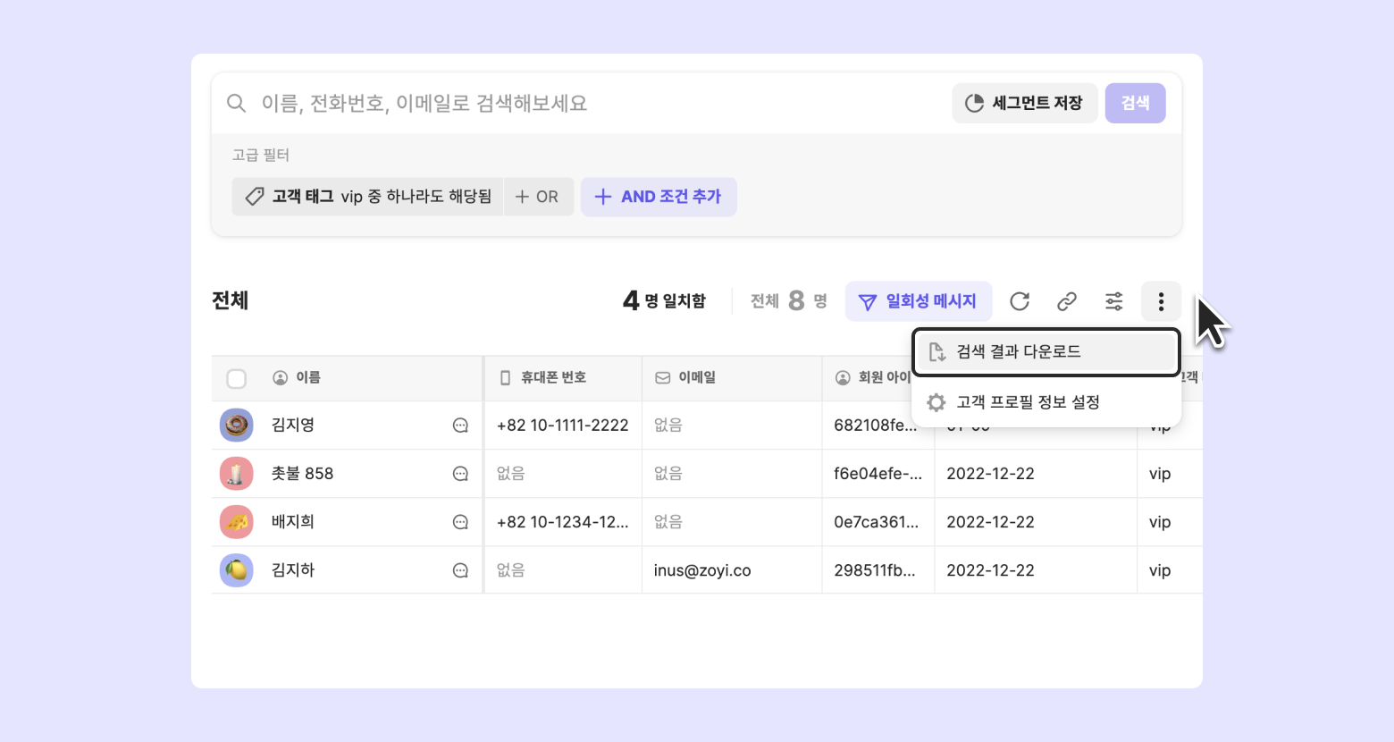 • 검색 결과 다운로드: 전체 고객 또는 필터링한 결과를 다운로드 할 수 있습니다. (→ 자세히 보기)