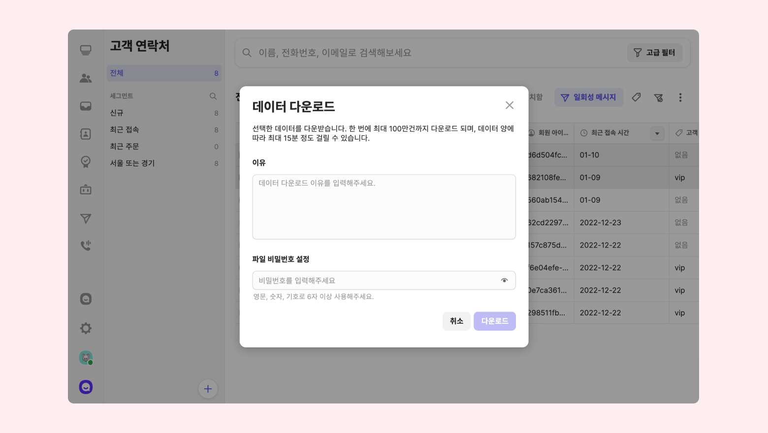 고객 연락처 데이터 엑셀파일 다운로드는 데이터 다운로드 권한을 가진 구성원만 가능합니다. (→ 권한 설정하기)