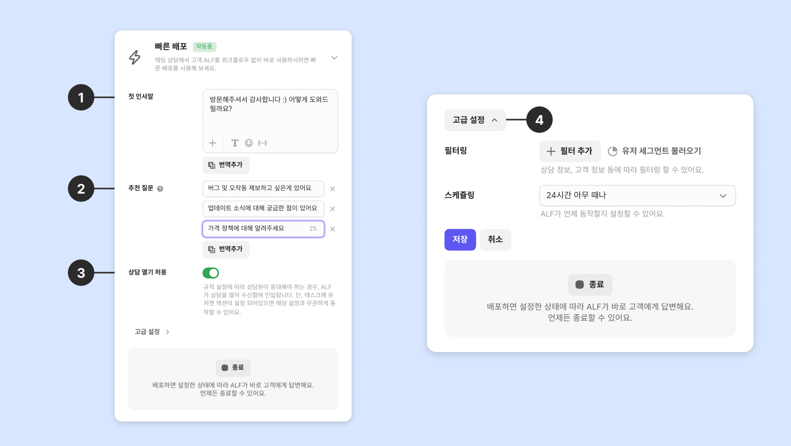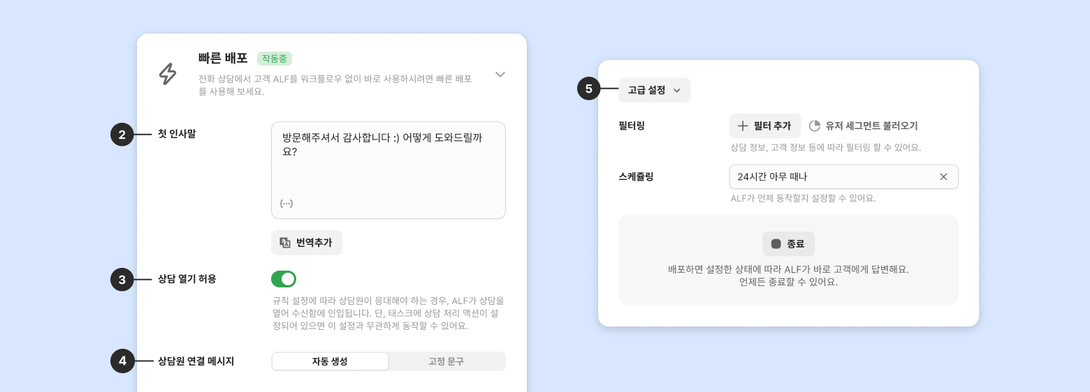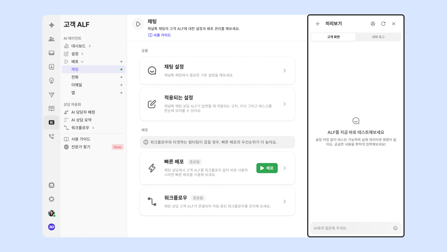 워크플로우 설정 없이 고객 ALF를 바로 사용하고 싶을 때 활용하는 기능입니다. 배포 버튼을 누르면 빠른 배포가 바로 적용됩니다.