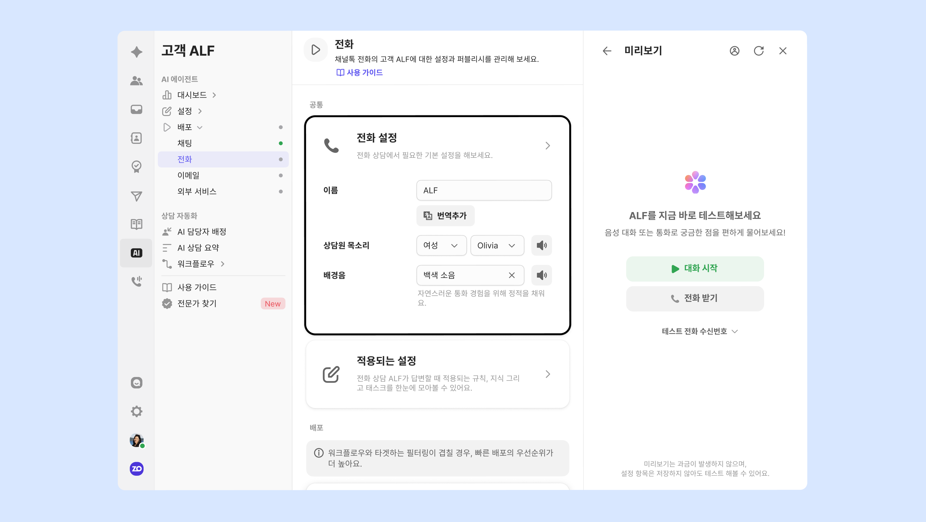 전화 상담에서 적용할 고객 ALF의 목소리, 배경음 등을 설정할 수 있어요. 모든 설정 완료 후 ALF와 전화 테스트를 진행해볼 수 있습니다.