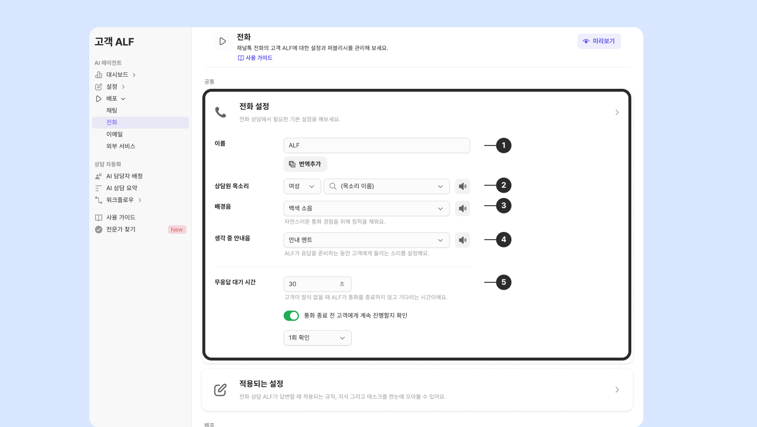 무응답 대기 시간: 고객이 답변이 없을 경우 전화 ALF가 통화를 종료하지 않고 기다리는 시간을 설정할 수 있어요.