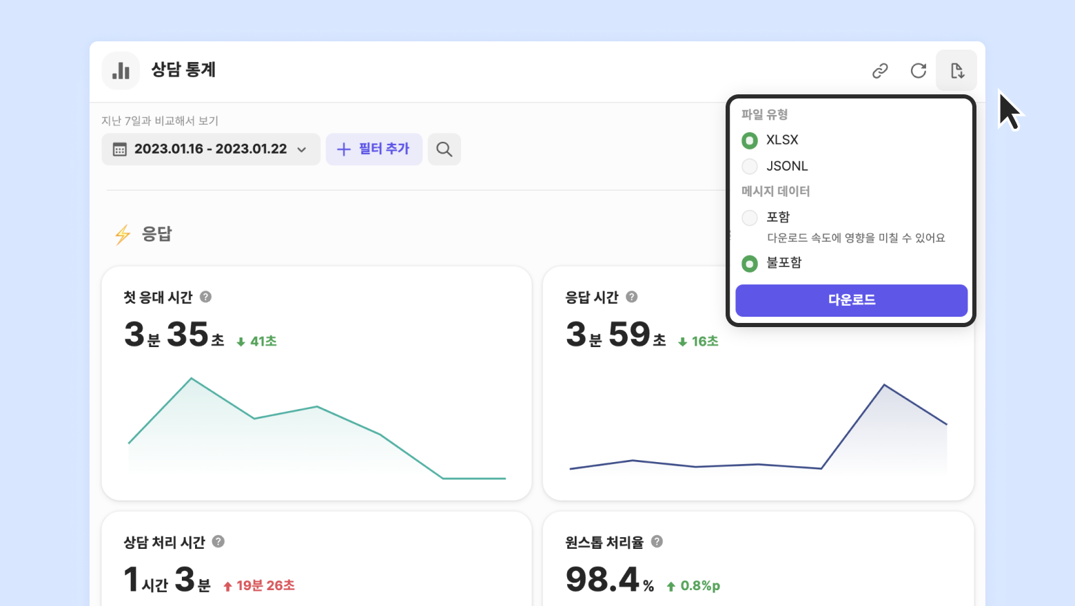 상담통계에서 확인하지 못하는 내용들이 있나요? 대시보드를 통해 확인이 어려운 내용이라도 로우 데이터를 엑셀 혹은 json 파일로 다운로드하여 원하는 형식으로 가공이 가능해요.