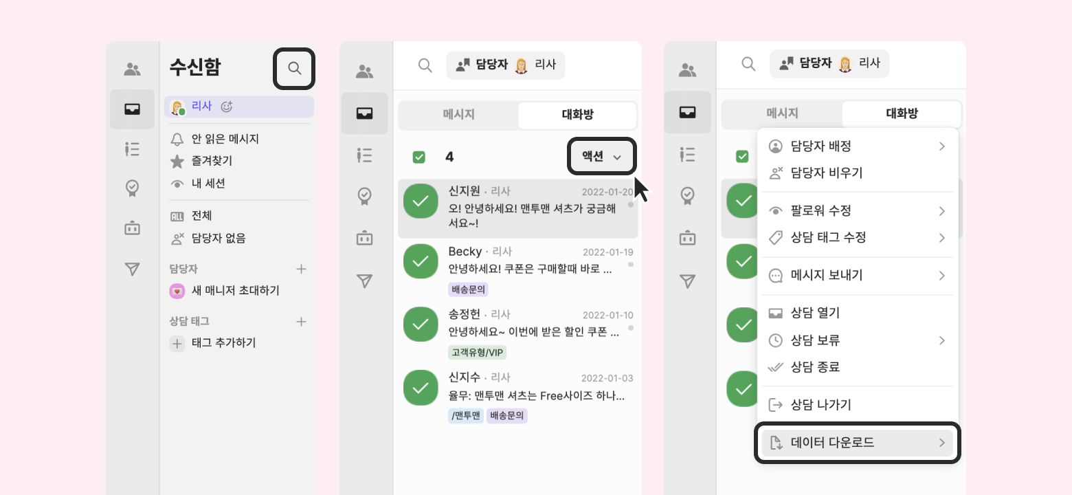 경로: [수신함] - [돋보기 버튼] - [조건 설정] - [상담 선택] - [액션] - [데이터 다운로드]