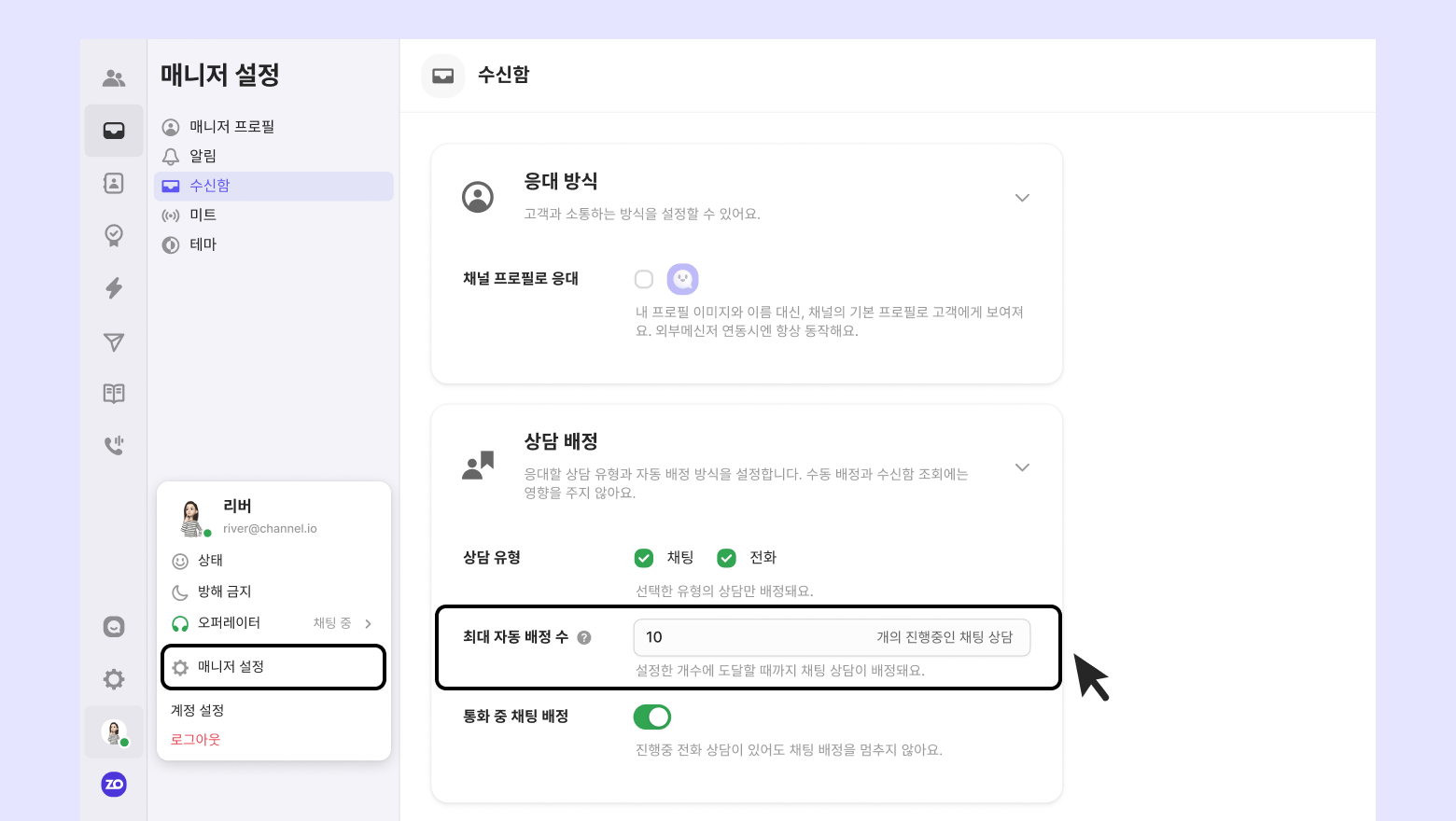 • 설정 경로: [개인 설정] - [팀 멤버 설정] - [수신함] - [최대 자동 배정 수] 또는 [분석] - [오퍼레이터]