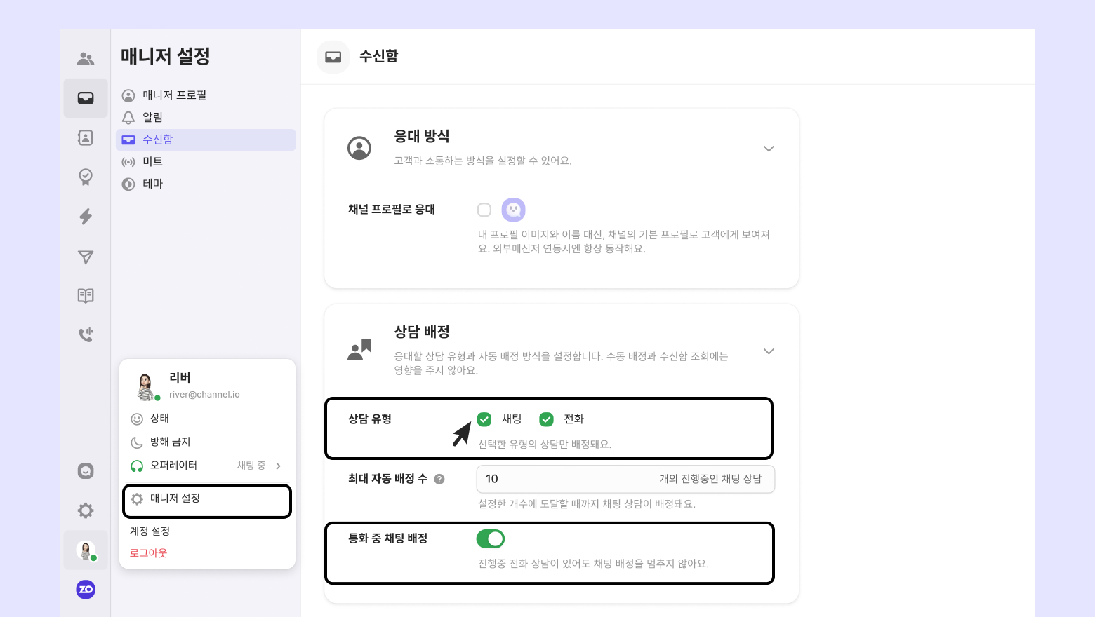• 설정 경로: [개인 설정] - [팀 멤버 설정] - [수신함] - [상담 배정]