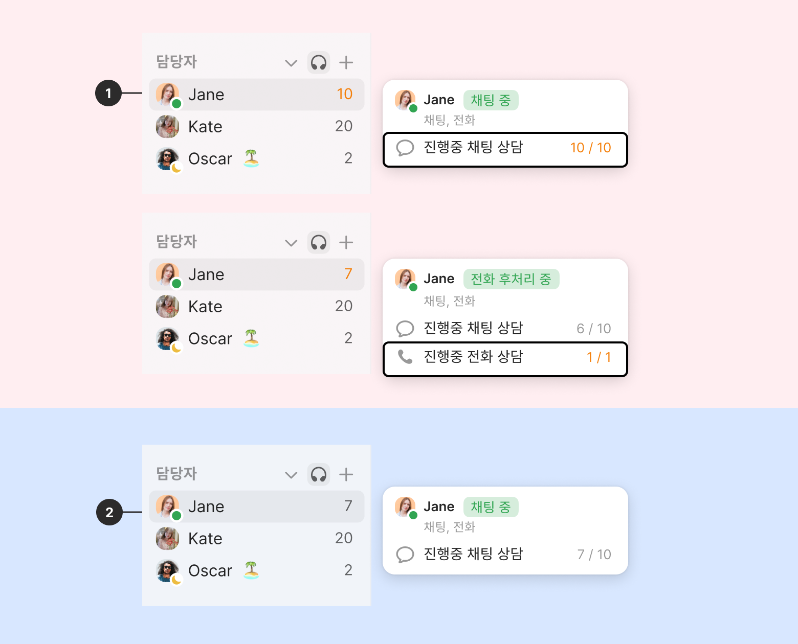 • 채팅과 전화 상담의 최대 자동 배정 수는 따로 관리되어요. 전화 상담은 최대 자동 배정 수 설정과 관련없이 진행중 전화 상담이 없으면 자동 배정됩니다.