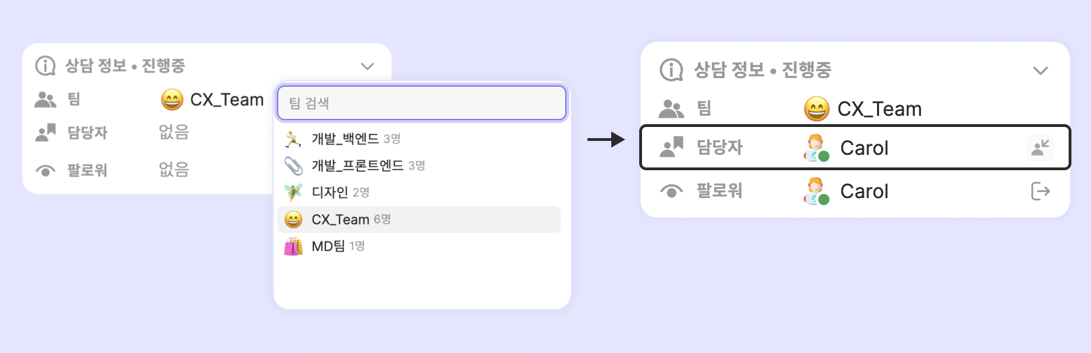 예시) 마케팅팀에 A, B, C 멤버 / 디자인팀에 B, C, D 멤버가 있는 상황일 때, A가 담당자인 상담에 담당 팀으로 디자인팀을 지정하면 ‘담당자 없음’ 상태로 변경됩니다. A는 디자인 팀에 속해있지 않기 때문이에요. B가 담당자인 상담에 담당 팀을 마케팅팀에서 디자인팀으로 변경하면 담당자는 변경되지 않습니다. B는 두 팀에 모두 속해있기 때문이에요.