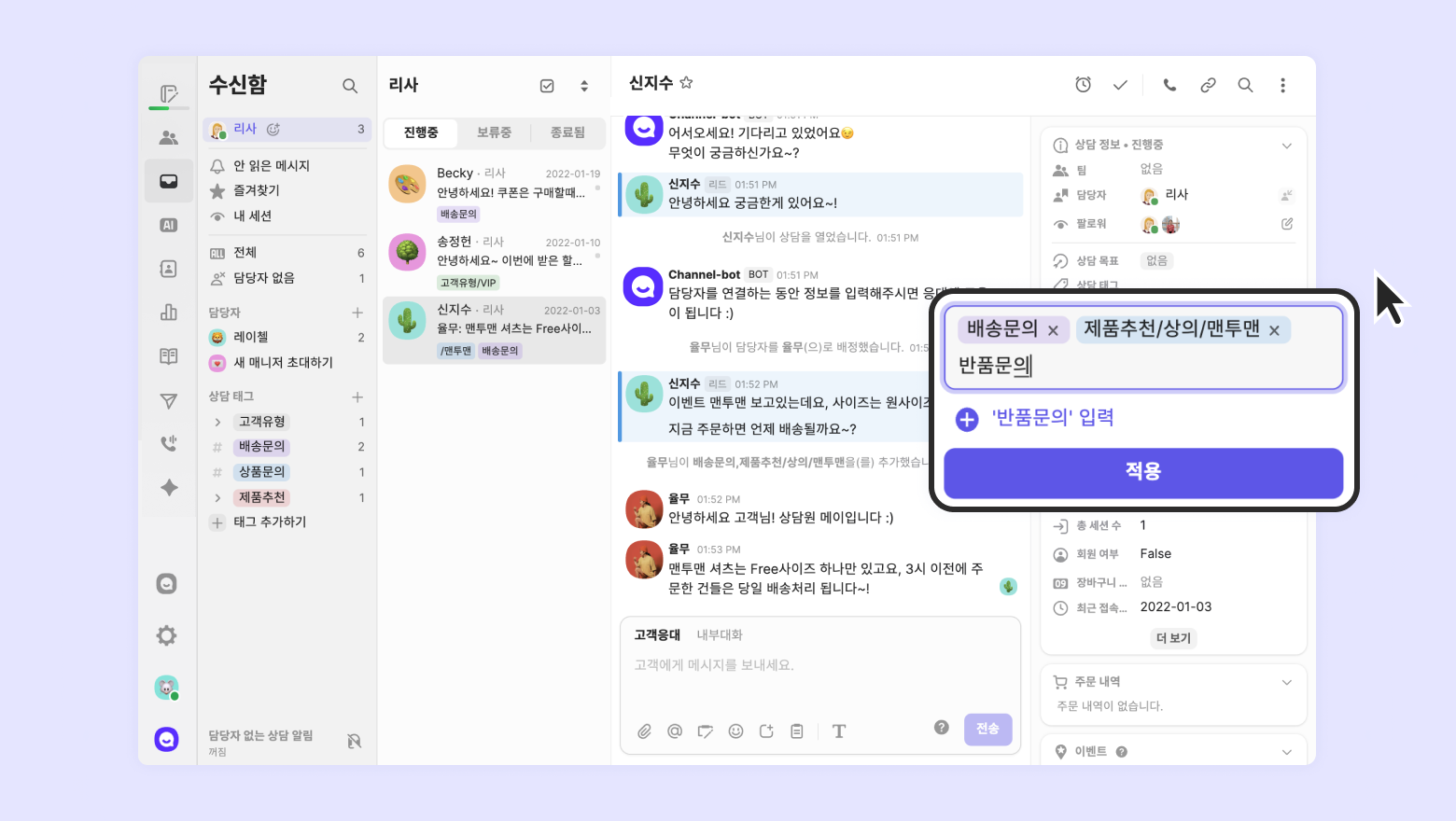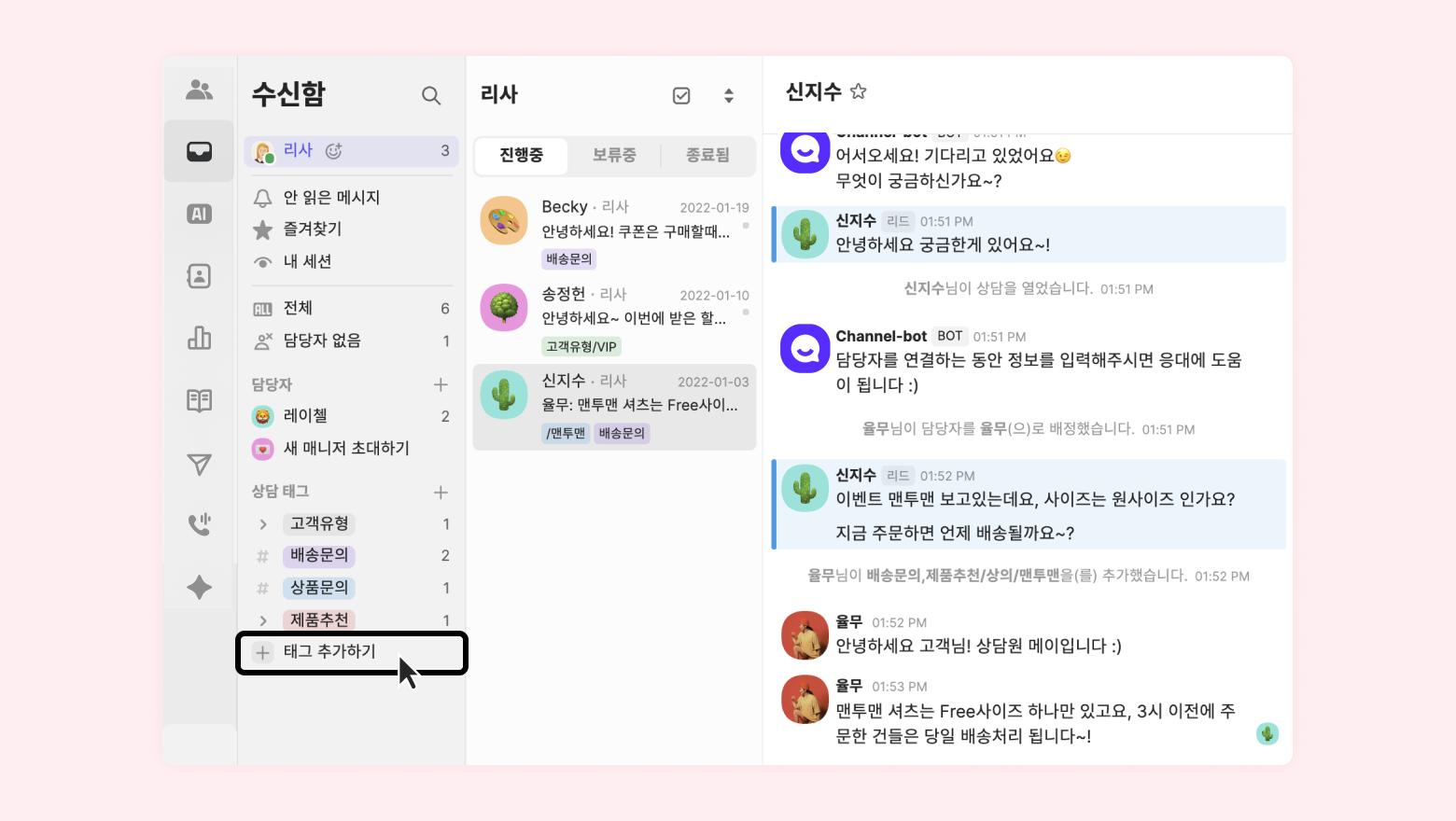 수신함 좌측 하단과, 상담 목록에는 태그가 보이지 않아요.