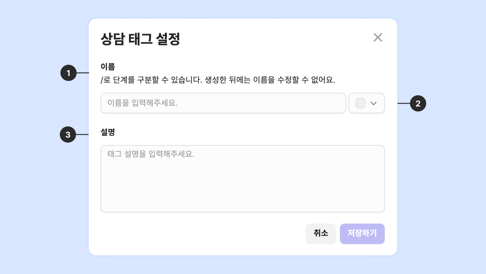 태그를 색상으로 구분하실 수 있습니다. 기능별 / 주제별로 같은 색상으로 태그를 만드셔서 상담을 분류하실 수 있습니다.