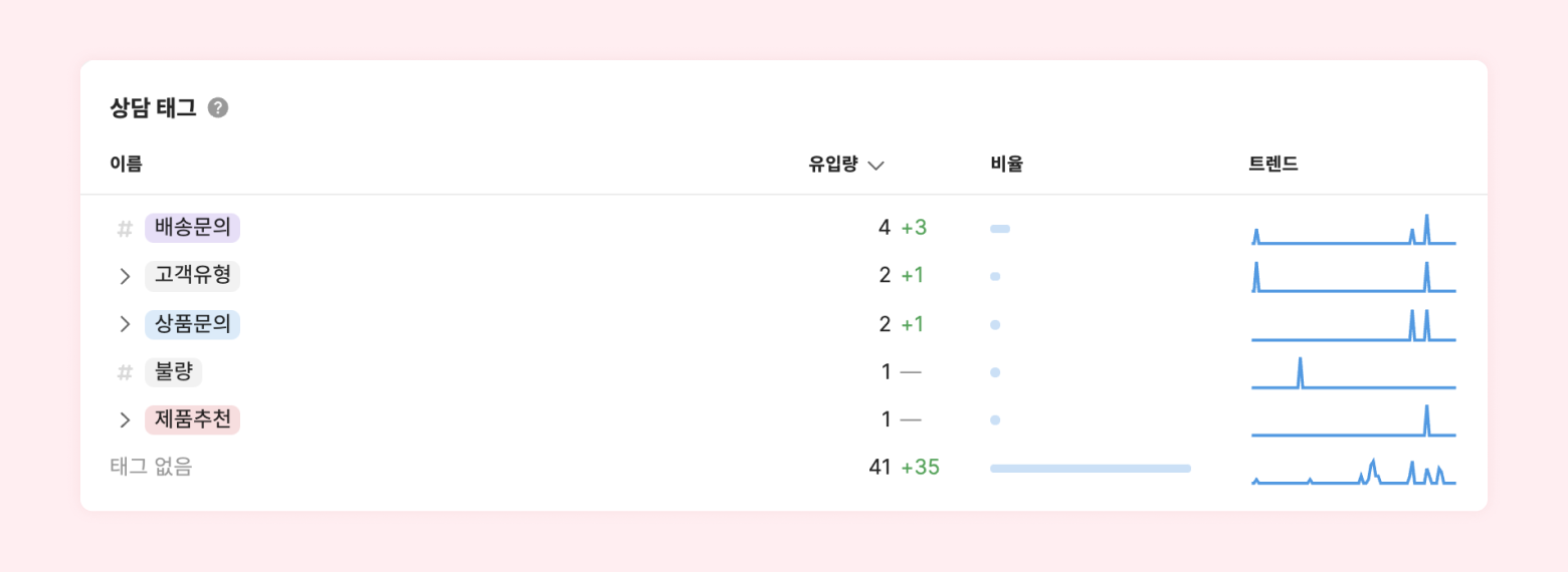 상담 통계에서 해당 기간동안 어떤 태그의 상담이 많이 들어오는지, 전체 상담 중 어떤 비중을 차지하고 있는지, 기간별로 유입 트랜드는 어떤 변화가 있었는지 확인을 통해 비즈니스의 문제점을 분석할 수 있습니다.