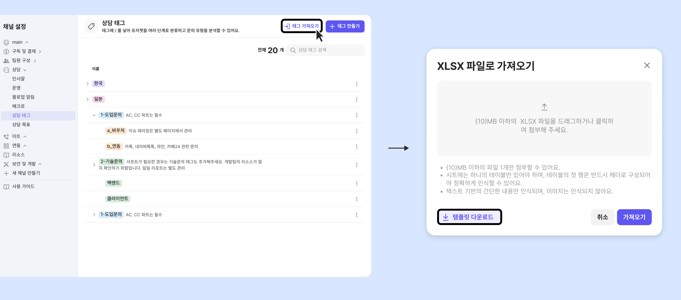 많은 양의 상담태그를 설정해야 할 때 XLSX 파일로 한 번에 등록할 수 있어요.