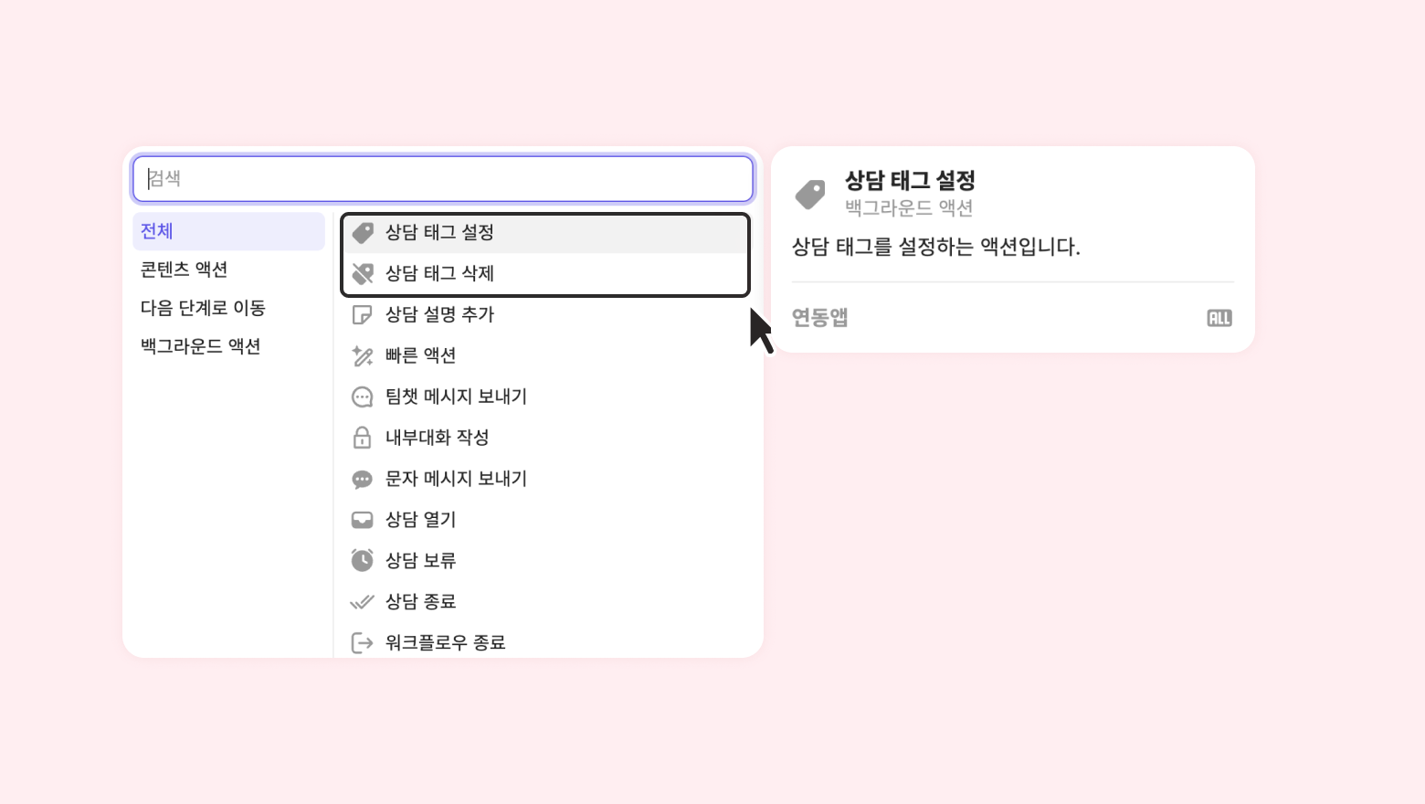 워크플로우의 액션 설정을 통해, 특정 단계에 들어온 고객의 문의에 자동으로 상담 태그를 설정하거나 삭제할 수 있습니다.