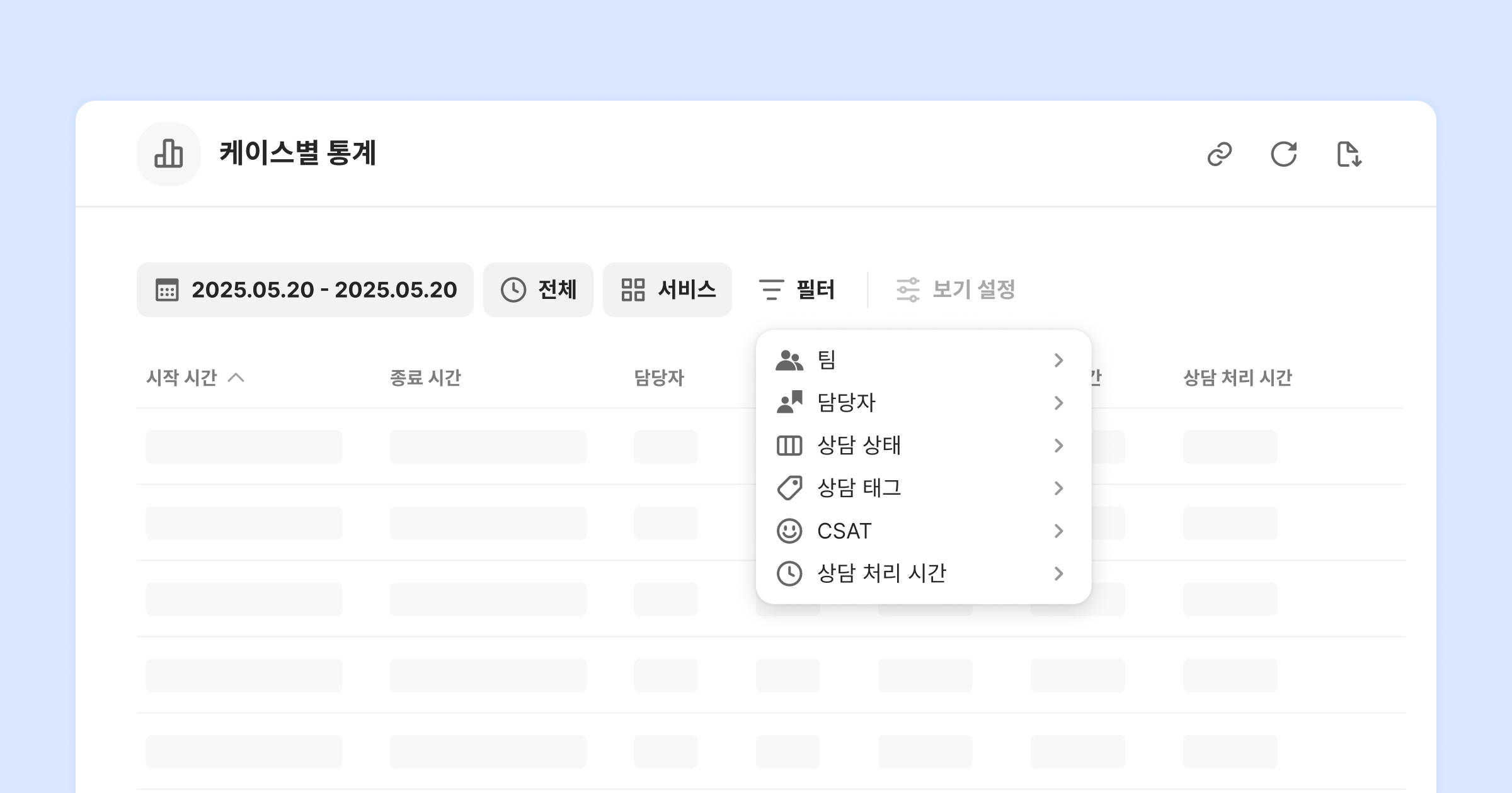 서비스, 팀, 담당자, CSAT, 상담 상태 등은 ‘OR 조건’으로 적용되며, 해당 조건을 만족하는 상담 건의 전체 케이스가 함께 노출됩니다.