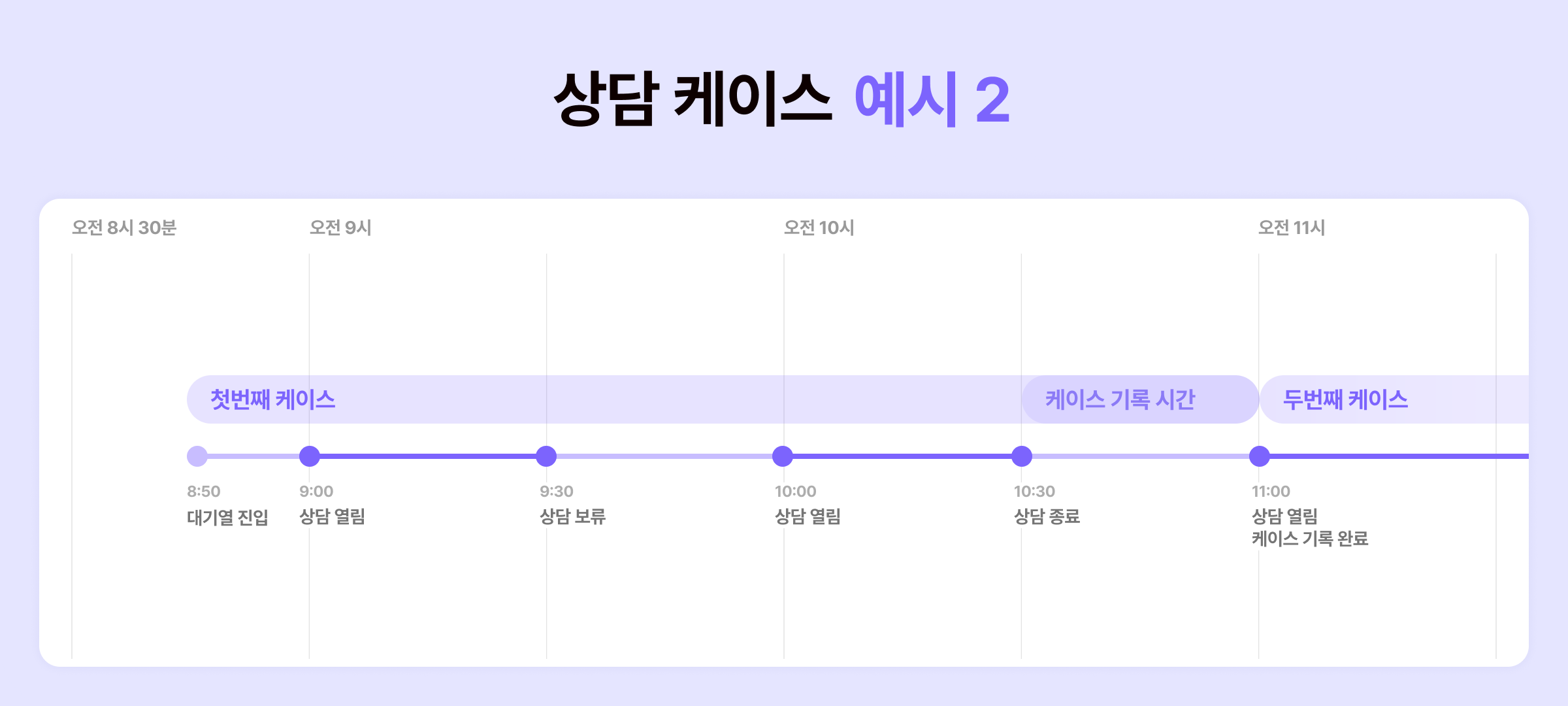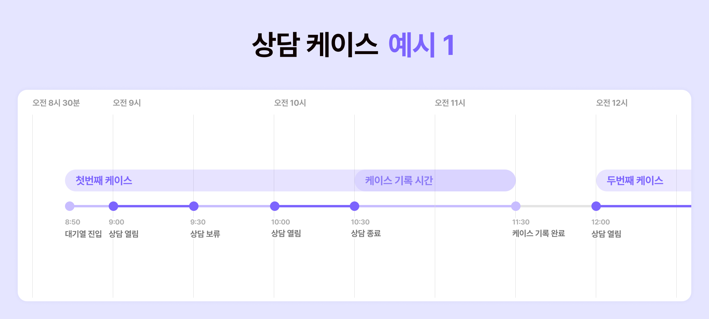 단, 1시간 이내에 다시 상담이 열리는 경우 즉시 케이스 기록이 종료되며, 다음 케이스가 생성되어 기록됩니다.