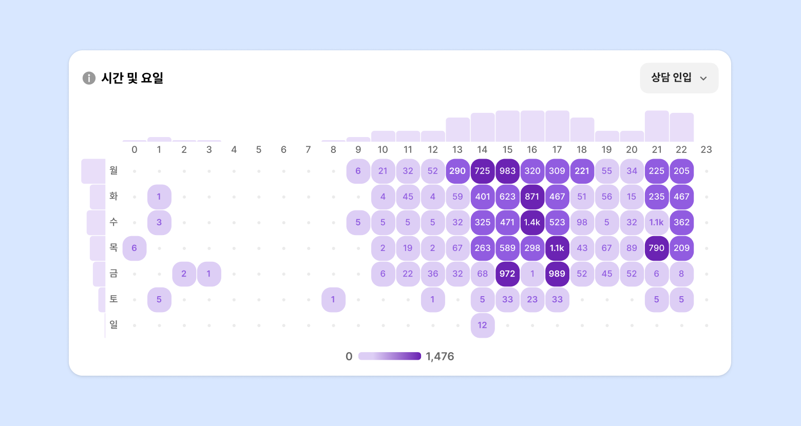 기간 내 시작되거나 종료된 상담을 시간대 및 요일별 분포로 확인할 수 있습니다.