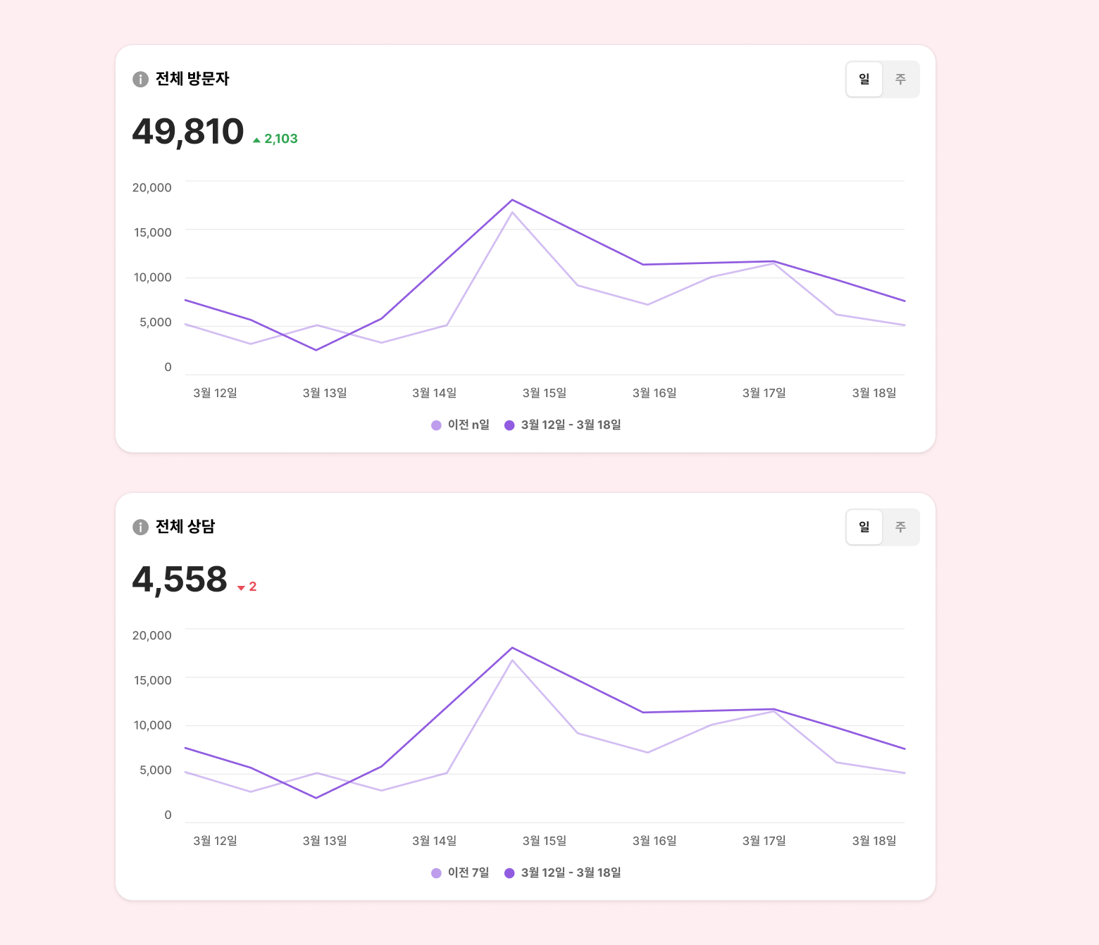 설정한 기간 동안의 전체 방문자 수와 전체 문의 수를 확인할 수 있습니다.