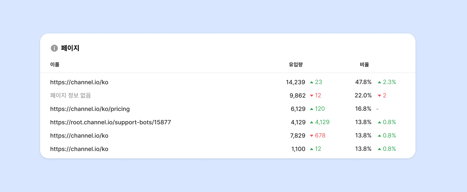 설정한 기간동안 웹 또는 앱의 어떤 페이지에서 채팅 버튼을 통해 상담이 유입 되었는 지 확인이 가능해요. 이미 상담이 한 번 진행된 채팅 창으로 다시 말을 걸 경우, 최초 유입된 페이지 정보로 보여집니다.