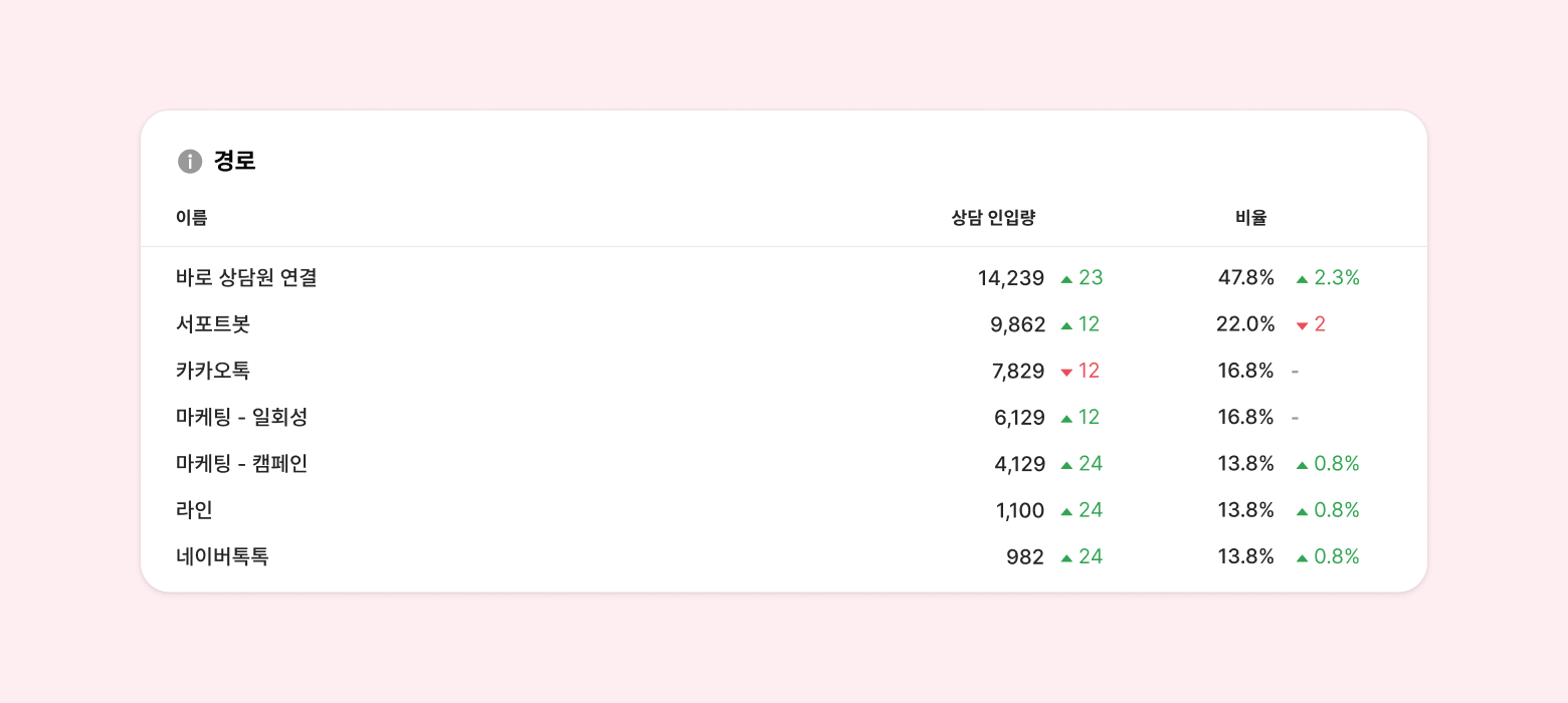 설정한 기간동안 어떤 경로를 통해 상담으로 유입 되었는 지 보여줍니다. 이미 상담이 한 번 진행된 상담으로 다시 말을 걸 경우, 최초 경로 정보 그대로 보여집니다.