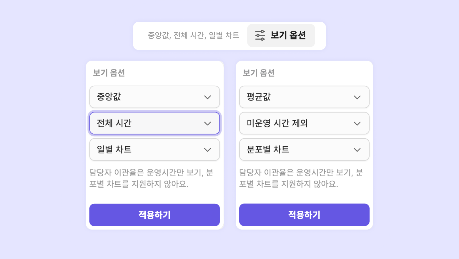 보기 옵션으로 전체시간/미운영시간제외, 평균값/중앙값 설정이 가능합니다.