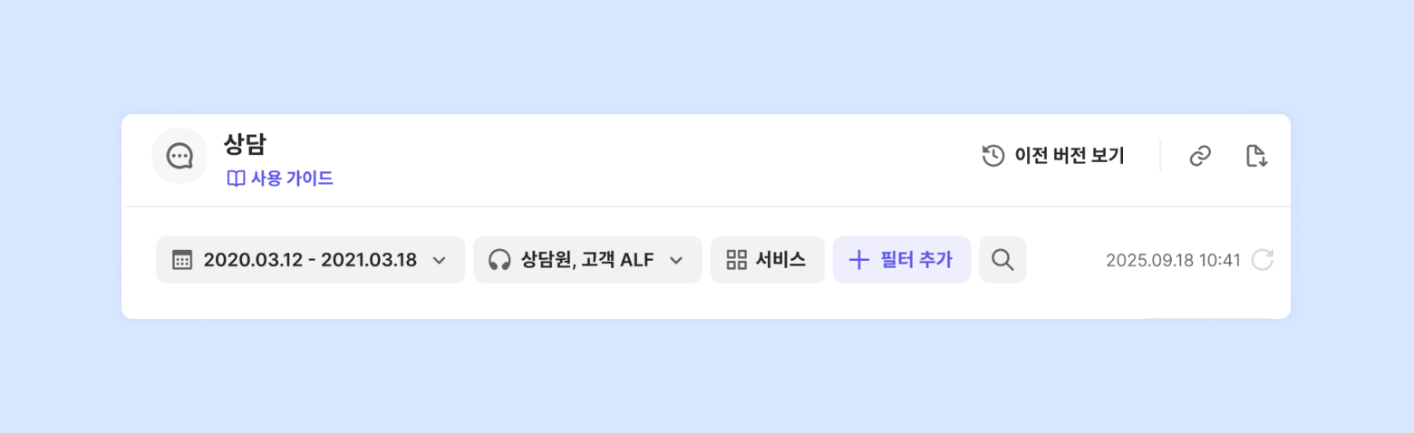 기간, 응대 주체, 상담 태그 등을 기준으로 필터링하여 검색할 수 있습니다.