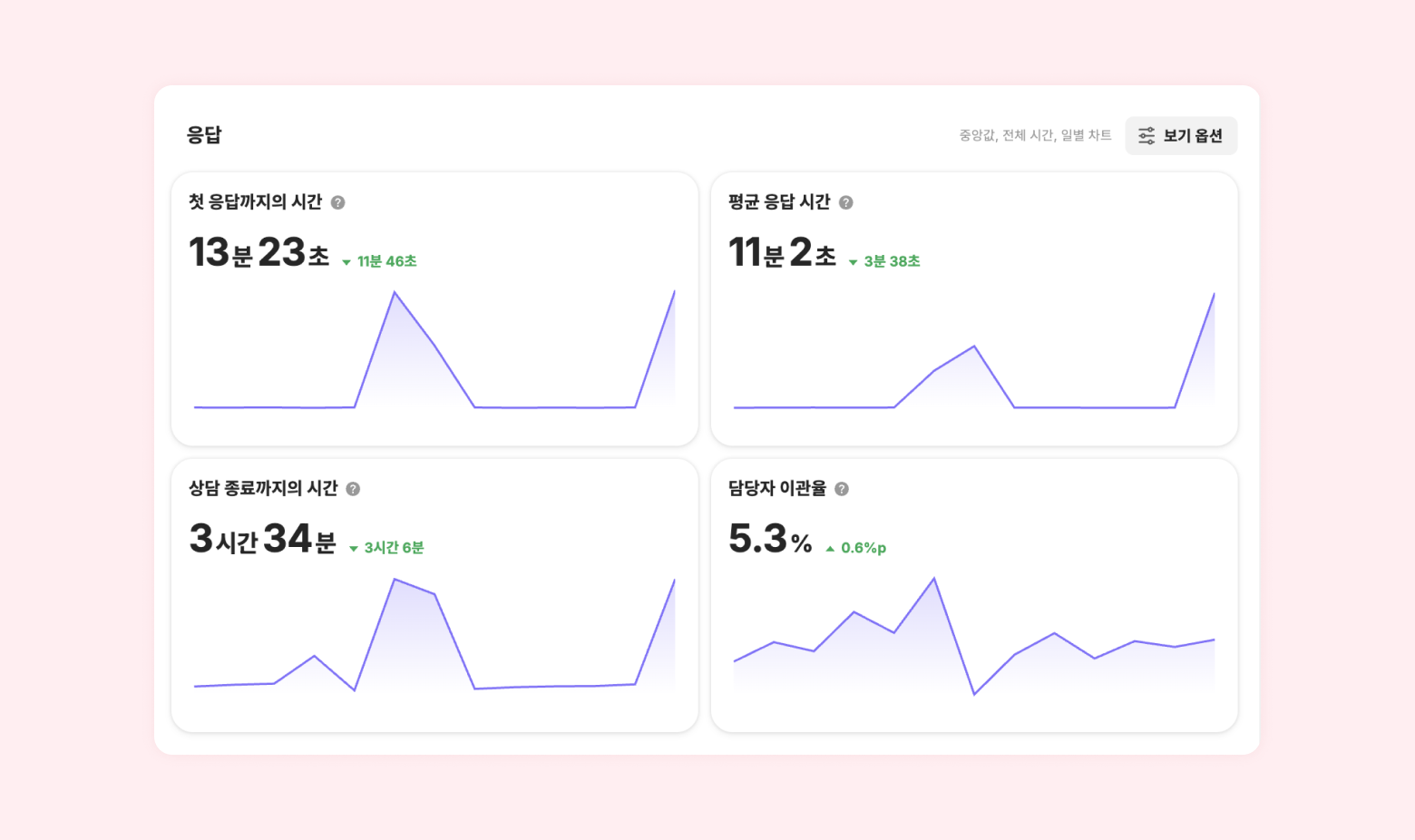 유입된 문의의 응답 시간이나 담당자 이관률 등을 확인할 수 있습니다. '보기 옵션'을 선택하면 원하는 조건에 맞춰 응답 결과를 확인할 수 있습니다.