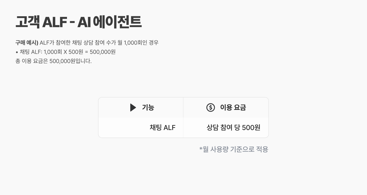 상담 참여당 과금이란: ALF가 최초 답변을 시작하고 ALF가 답변을 종료할 때까지를 1건으로 과금합니다. 담당자 연결 요청으로 상담이 열리거나 혹은 상담원이 개입하여 상담을 열거나 혹은 고객 답변으로부터 24시간이 지나 세션이 만료되면 ALF 답변이 종료됩니다.