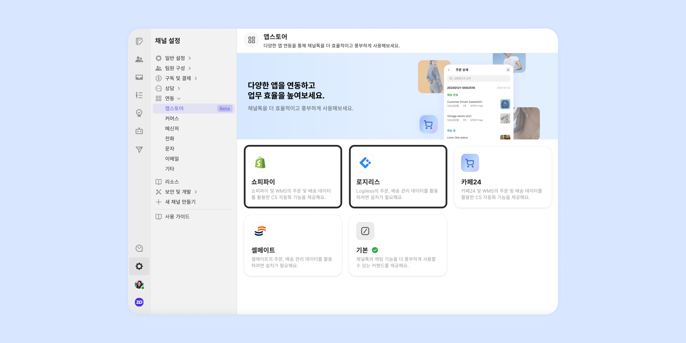 [채널톡] - [채널 설정] - [연동] - [앱스토어]에서 로지리스 앱 설치 후 연동 과정을 진행해 주세요.