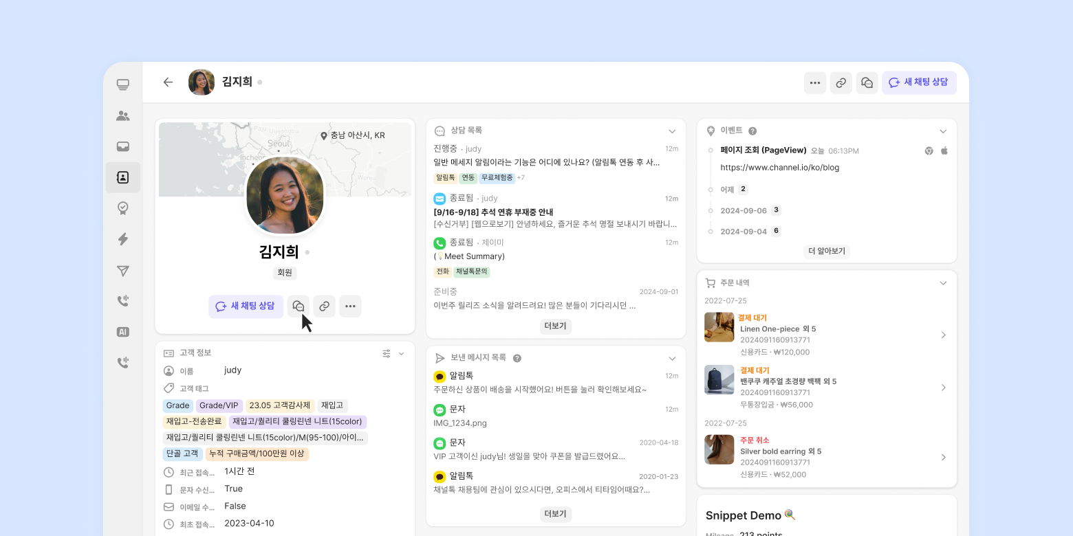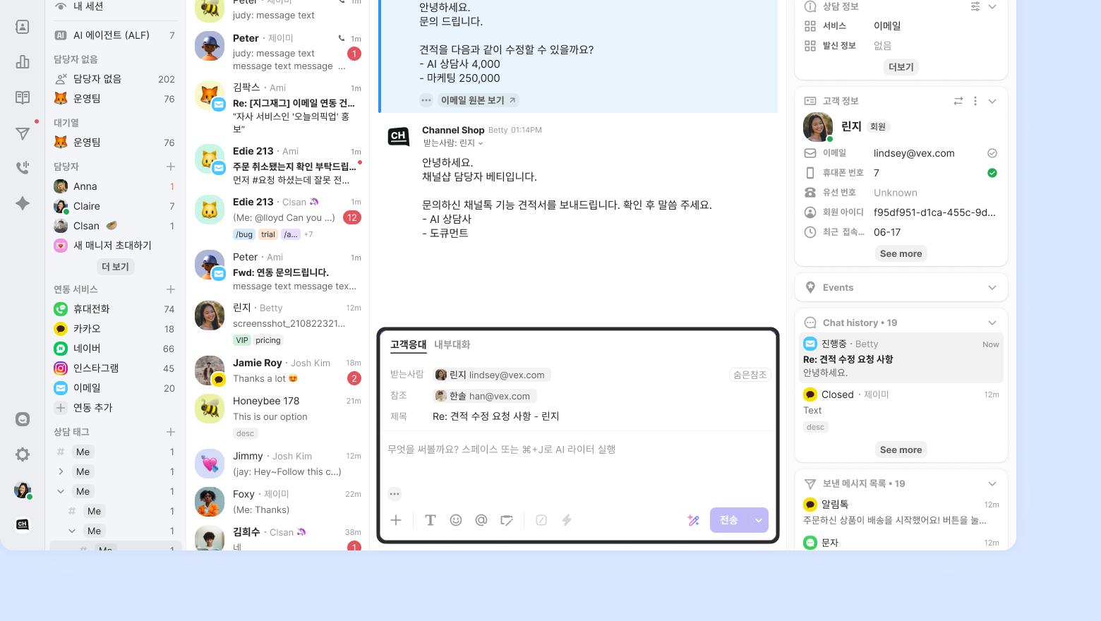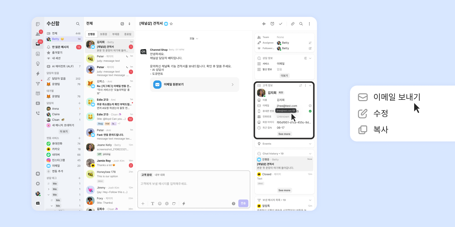 고객 연락처에 일치하는 검증된 이메일이 있는 경우, 동일한 고객으로 판단하여 대화 내역 및 정보가 연동됩니다.