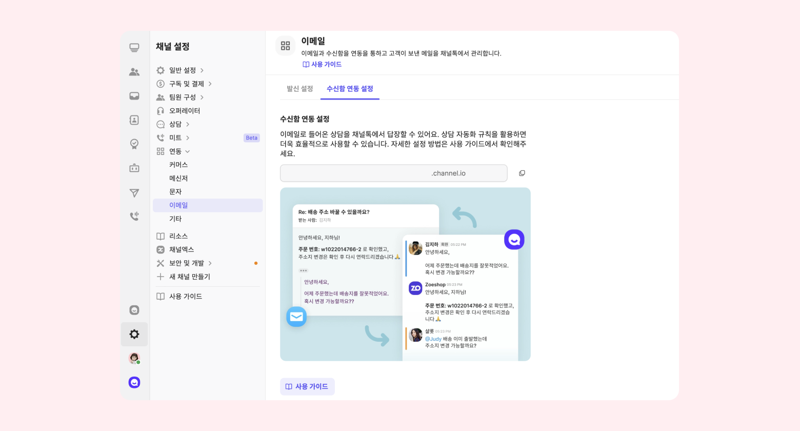 설정 경로: [채널 설정] - [연동] - [이메일] - [수신함 연동 설정] 클릭