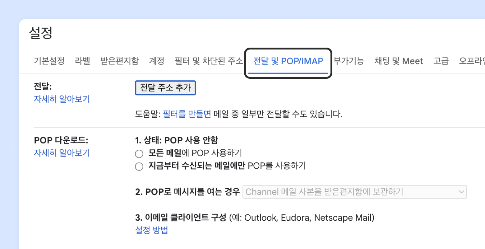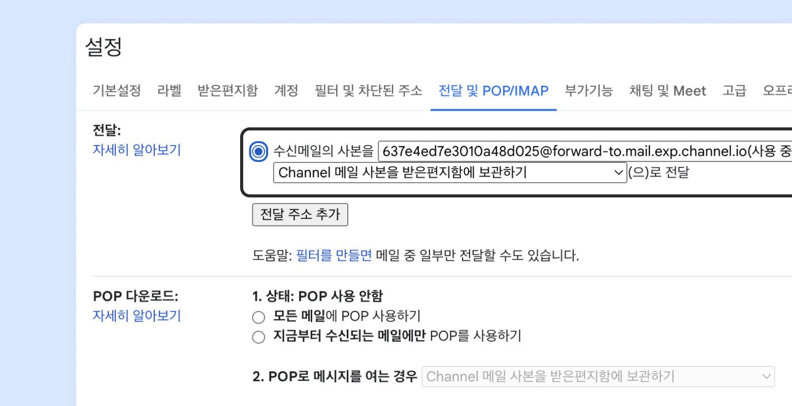 메일 [전달 및 POP/IMAP] 메뉴에서도 전달 설정을 체크한 후, 하단의 [변경사항 저장]을 클릭해주세요.