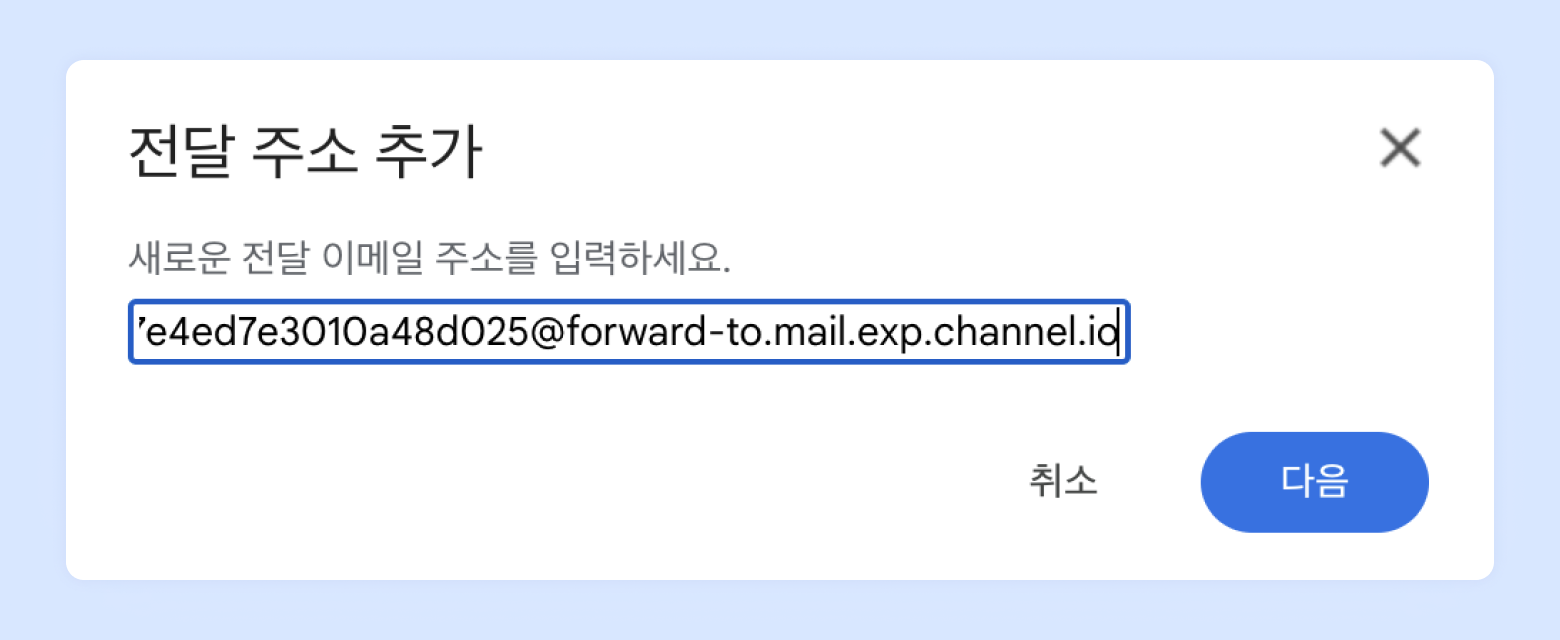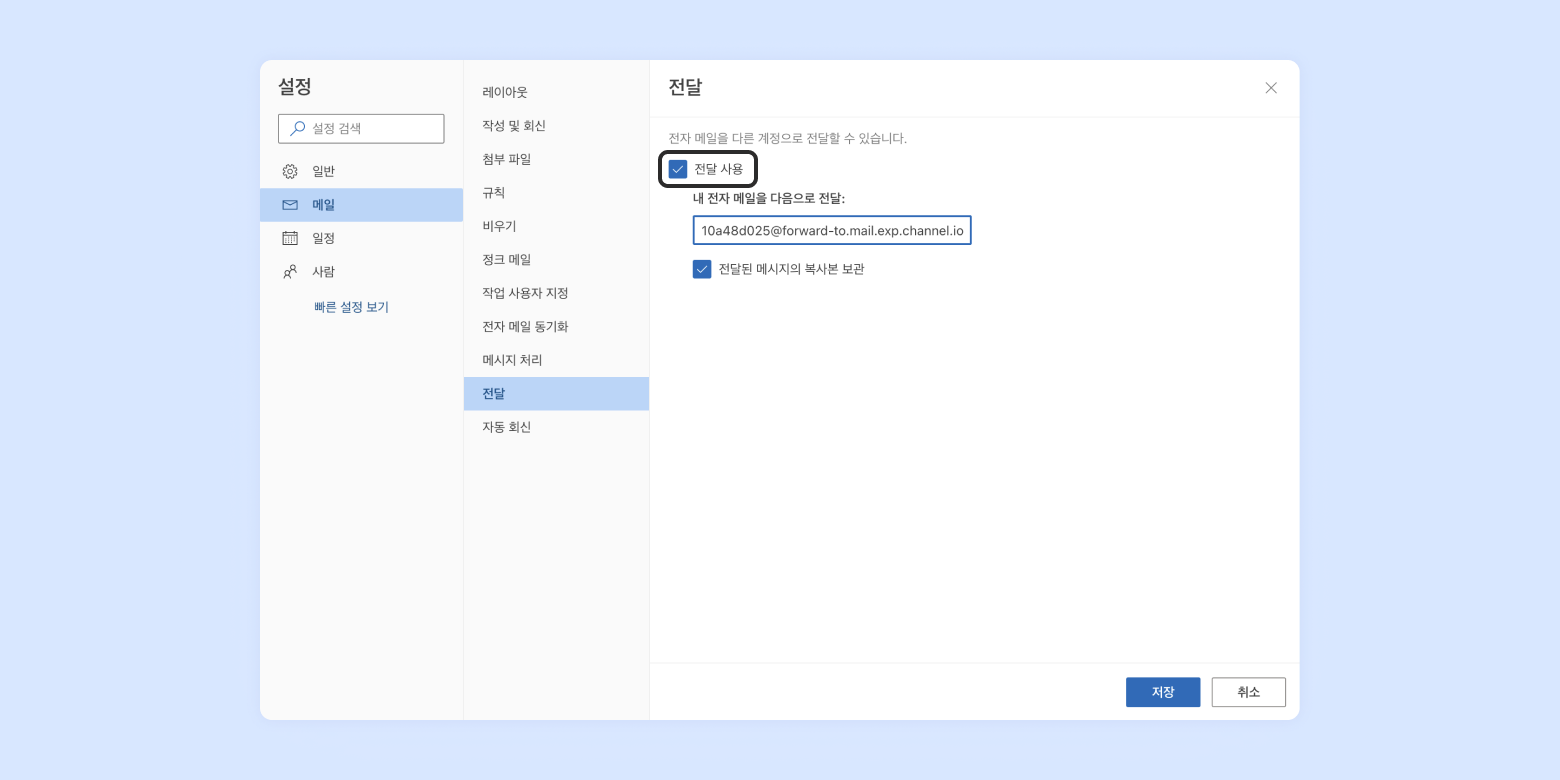 [전달 사용]을 클릭 후 복사한 이메일 주소를 넣어주세요.